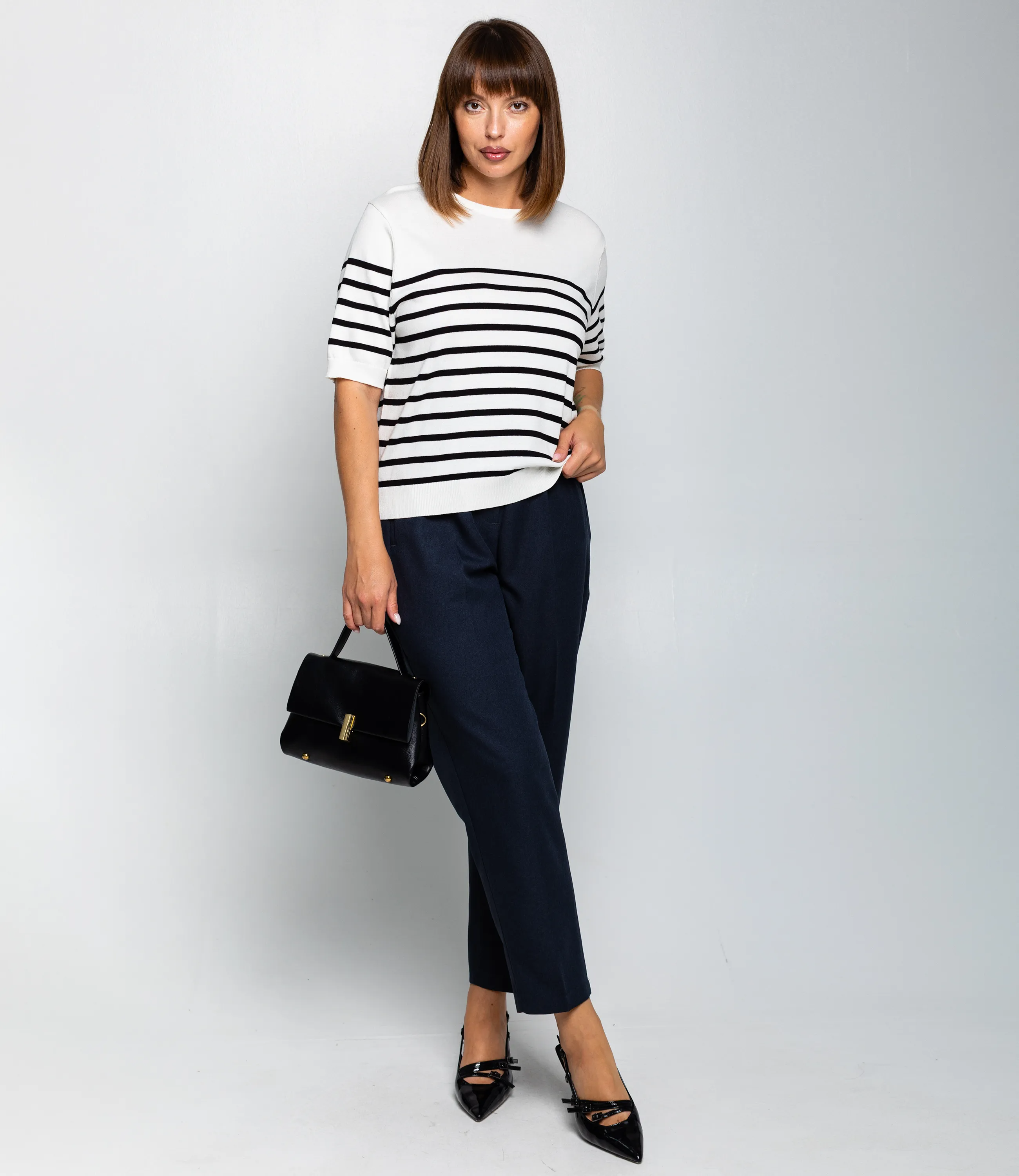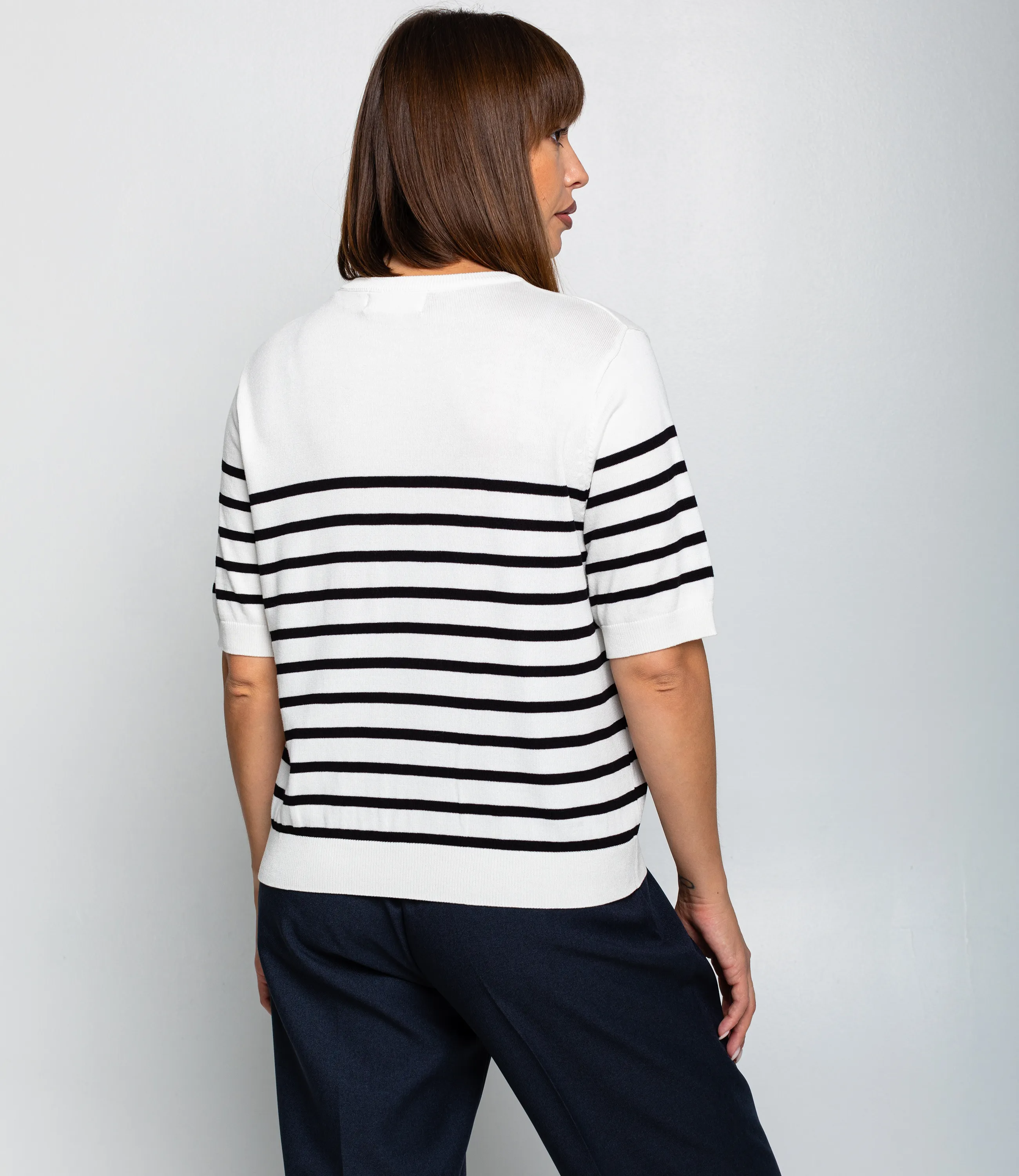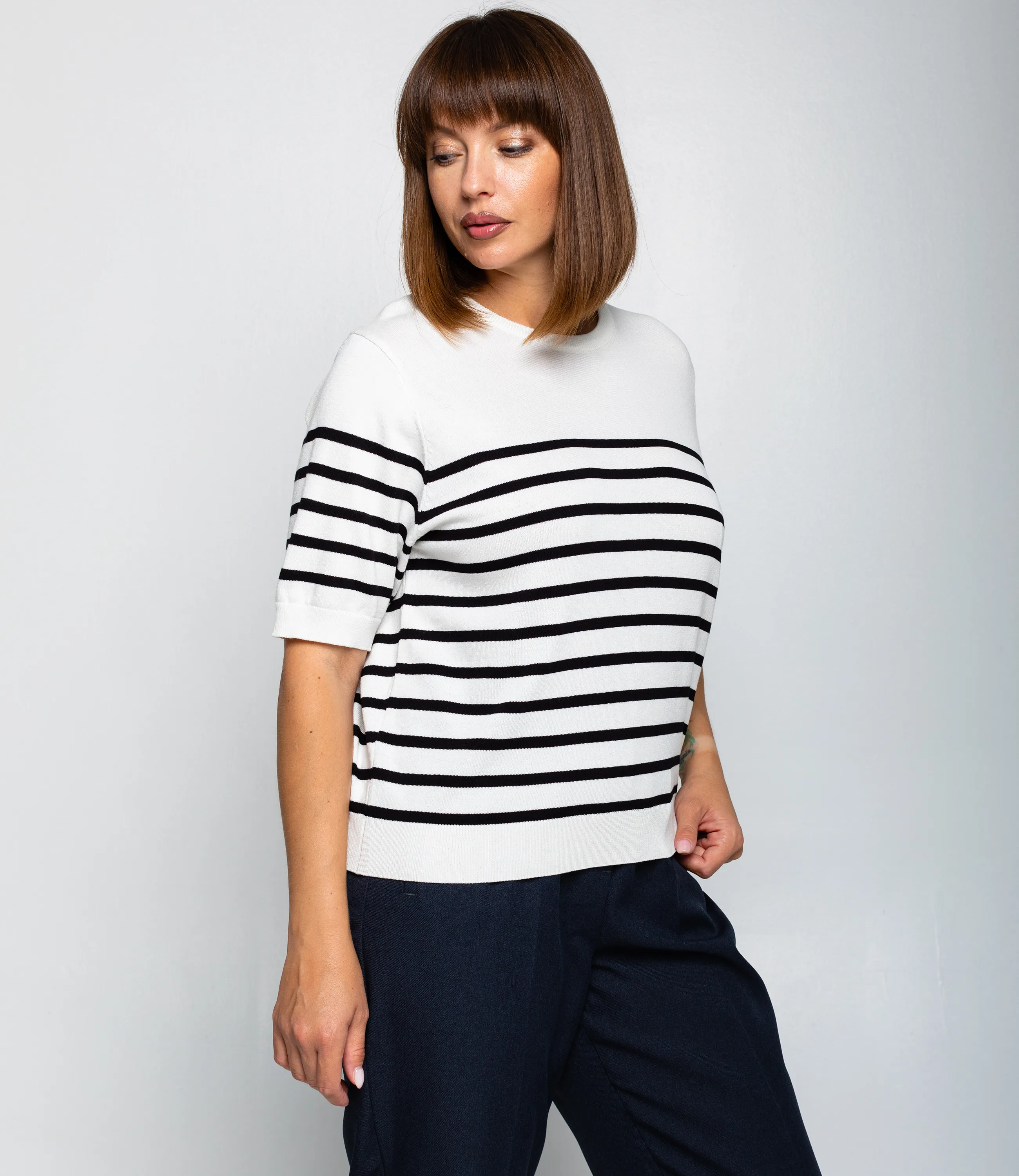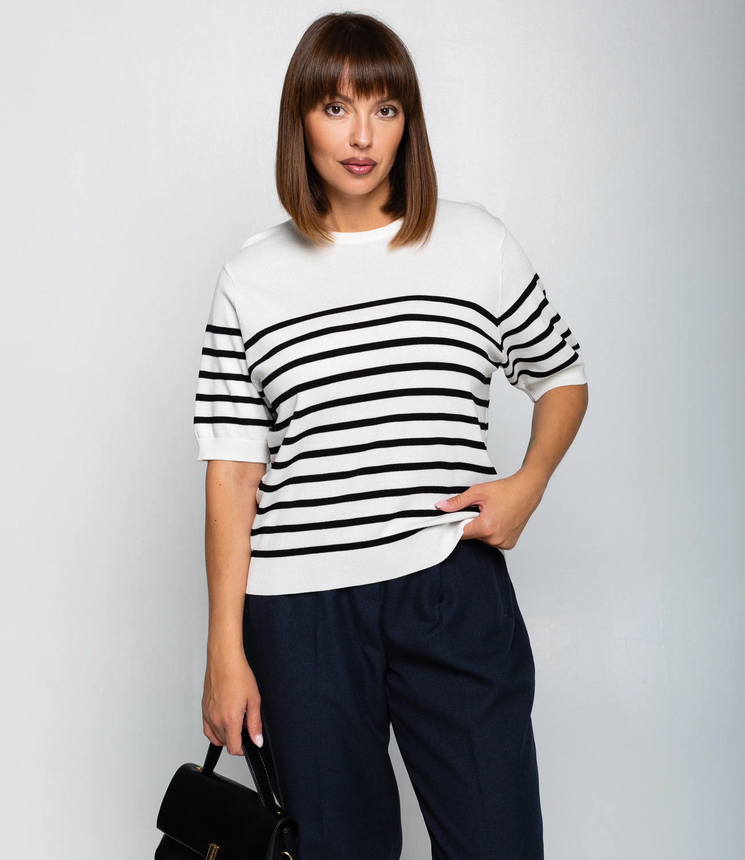 Эта футболка — прекрасный выбор для вашего магазина, предлагая стильный и универсальный дизайн, который станет отличным дополнением к гардеробу ваших клиентов. Футболка выполнена в полосатой морской стилистике: основа с поперечными полосами одинаковой ширины, верхняя часть плеч и горловина однотонные, полосы начинаются чуть ниже линии плеч. Вырез горловины круглый, невысокий, с аккуратной трикотажной планкой. Рукава короткие, доходят до середины предплечья, с широкой манжетой, на которой рисунок полос продолжается. Фасон свободный, слегка укороченный, линия низа заканчивается выше талии и оформлена плотной трикотажной резинкой для лёгкой сборки. Выполненная из 90% акрила, 10% шерсти, футболка обеспечивает отличное качество и приятные тактильные ощущения. Независимо от сезона, она станет любимым элементом в гардеробе ваших клиентов. На странице сайта доступна таблица размеров, что позволит вашим покупателям легко найти подходящий вариант. Установленная цена делает эту футболку доступной для широкой аудитории, что обеспечит вам высокий уровень продаж.