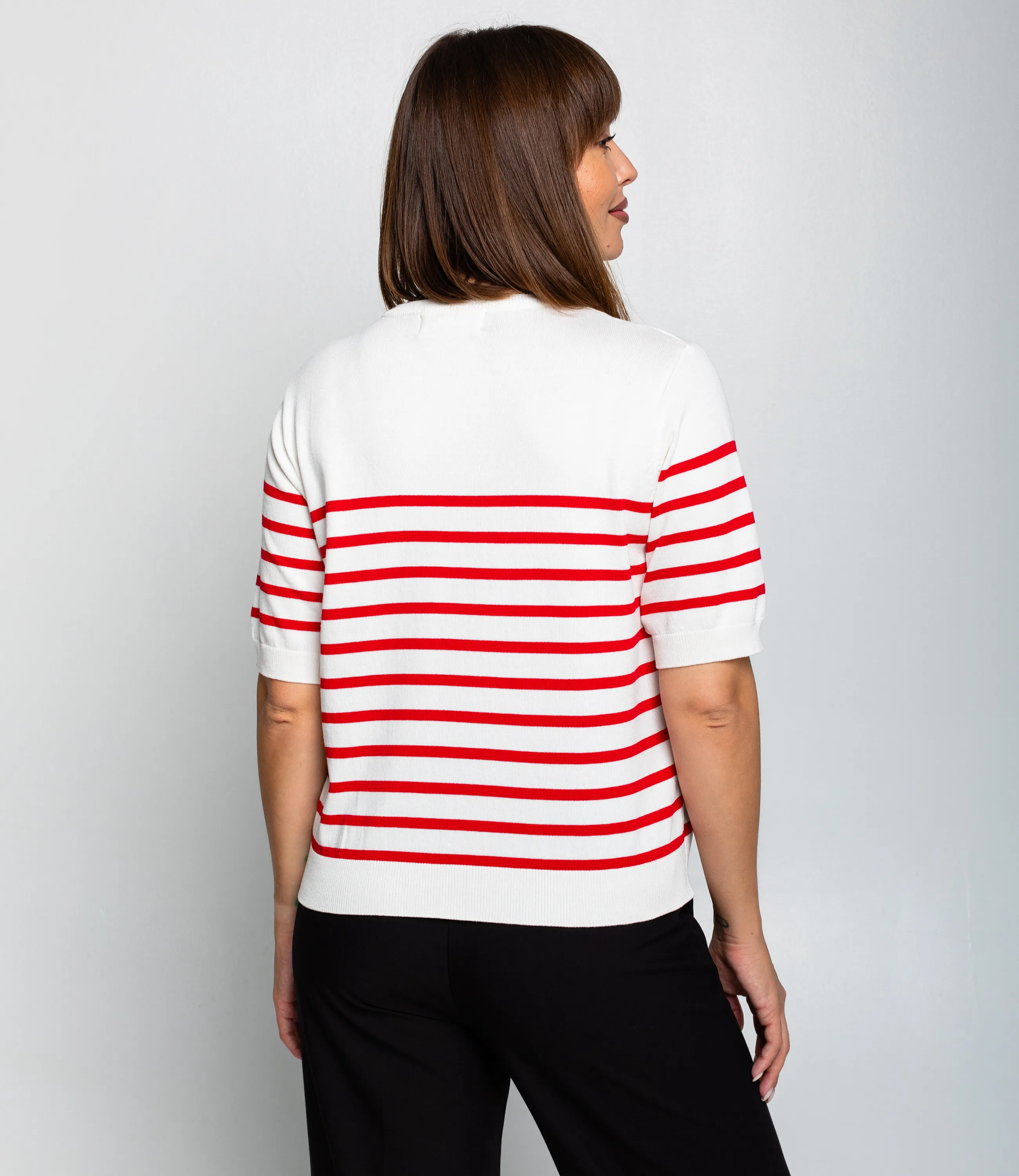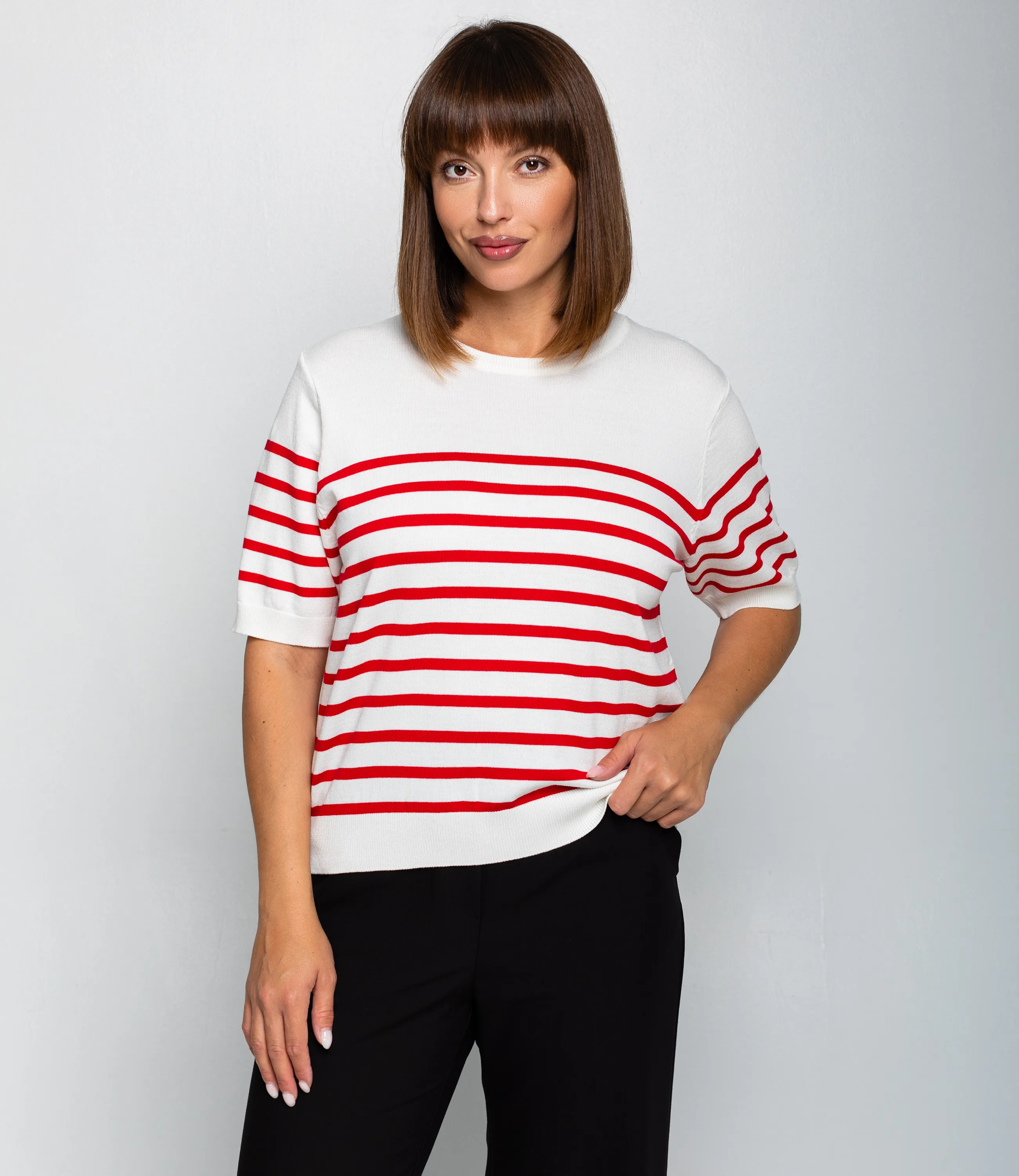 Эта футболка — прекрасный выбор для вашего магазина, предлагая стильный и универсальный дизайн, который станет отличным дополнением к гардеробу ваших клиентов. Футболка выполнена в полосатой морской стилистике: основа с поперечными полосами одинаковой ширины, верхняя часть плеч и горловина однотонные, полосы начинаются чуть ниже линии плеч. Вырез горловины круглый, невысокий, с аккуратной трикотажной планкой. Рукава короткие, доходят до середины предплечья, с широкой манжетой, на которой рисунок полос продолжается. Фасон свободный, слегка укороченный, линия низа заканчивается выше талии и оформлена плотной трикотажной резинкой для лёгкой сборки. Выполненная из 90% акрила, 10% шерсти, футболка обеспечивает отличное качество и приятные тактильные ощущения. Независимо от сезона, она станет любимым элементом в гардеробе ваших клиентов. На странице сайта доступна таблица размеров, что позволит вашим покупателям легко найти подходящий вариант. Установленная цена делает эту футболку доступной для широкой аудитории, что обеспечит вам высокий уровень продаж.