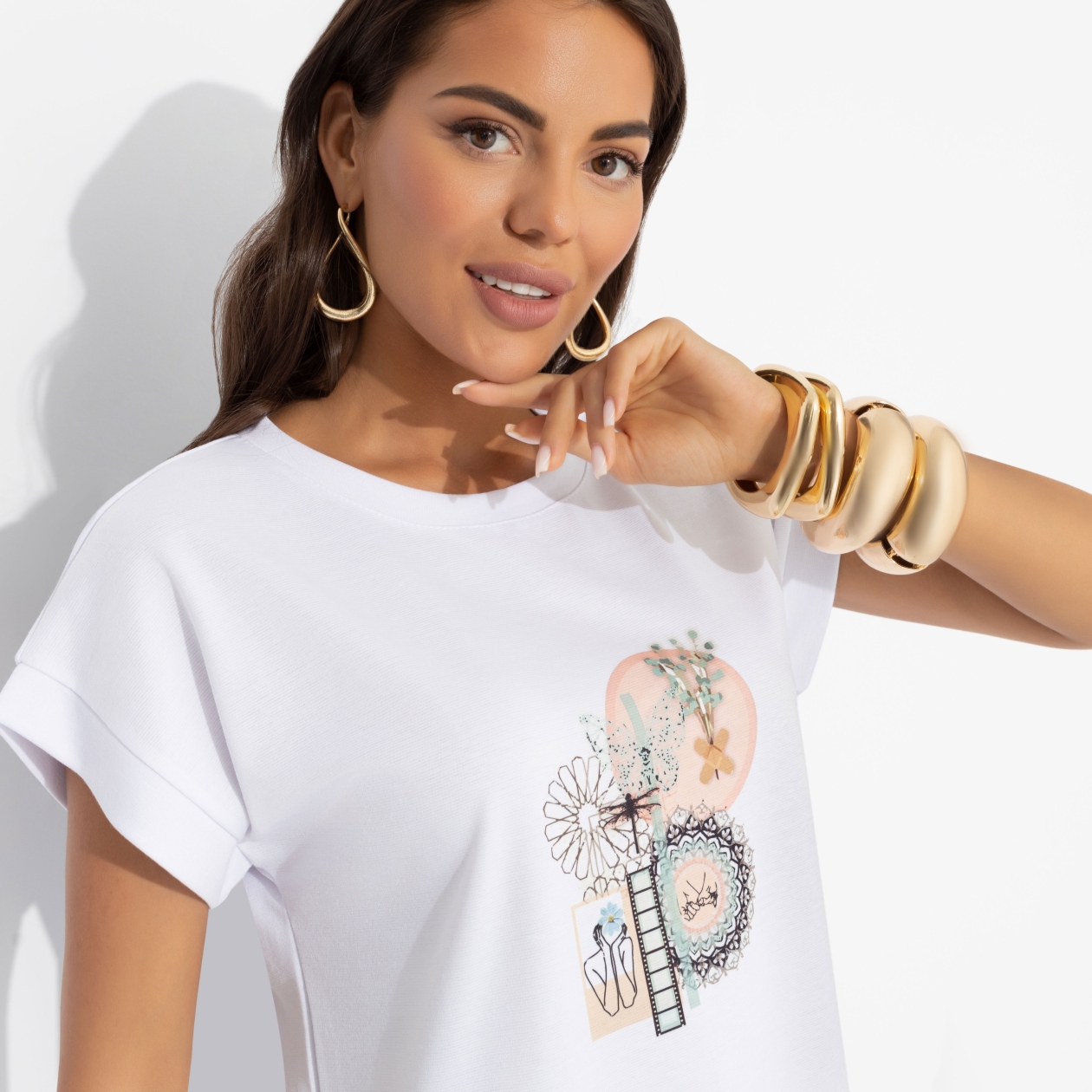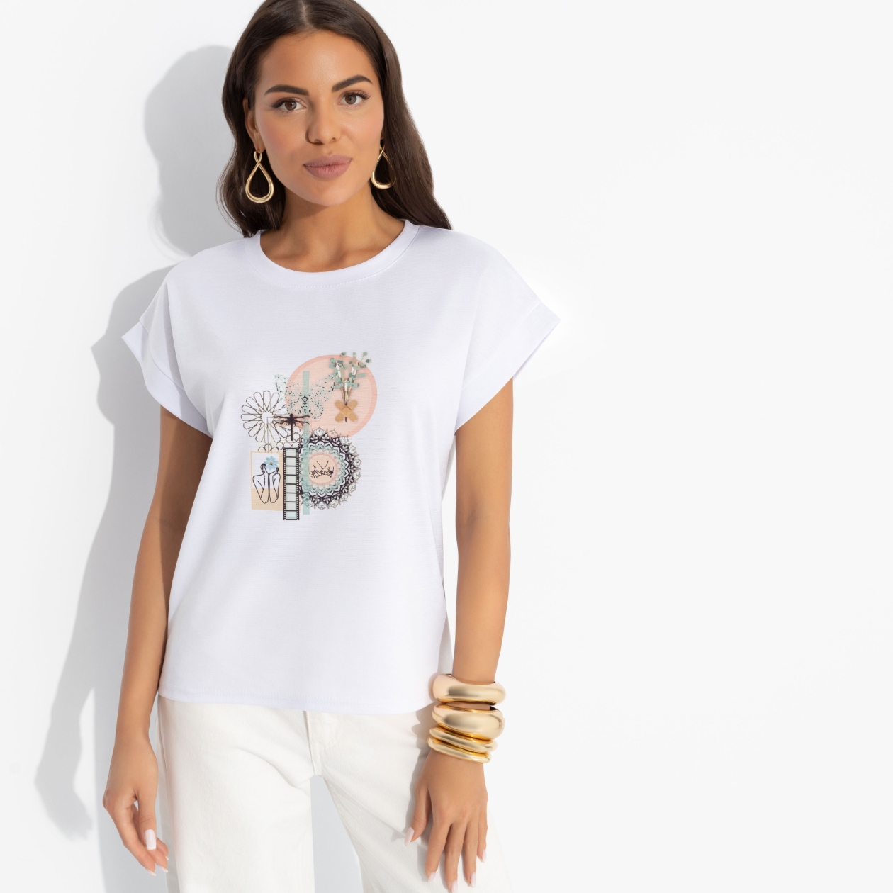Цвет настроения – белый. Быть откровенной, прямолинейной и педантичной. Ваш подход к жизни ценят друзья и члены семьи. Подавайте пример стиля и аккуратности в футболке от ЧАРУТТИ. Классический крой. Принт напечатан на материале. Линия плеча спущена, отвороты прошиты. Изделие хорошо смотрится в заправленном виде и навыпуск.