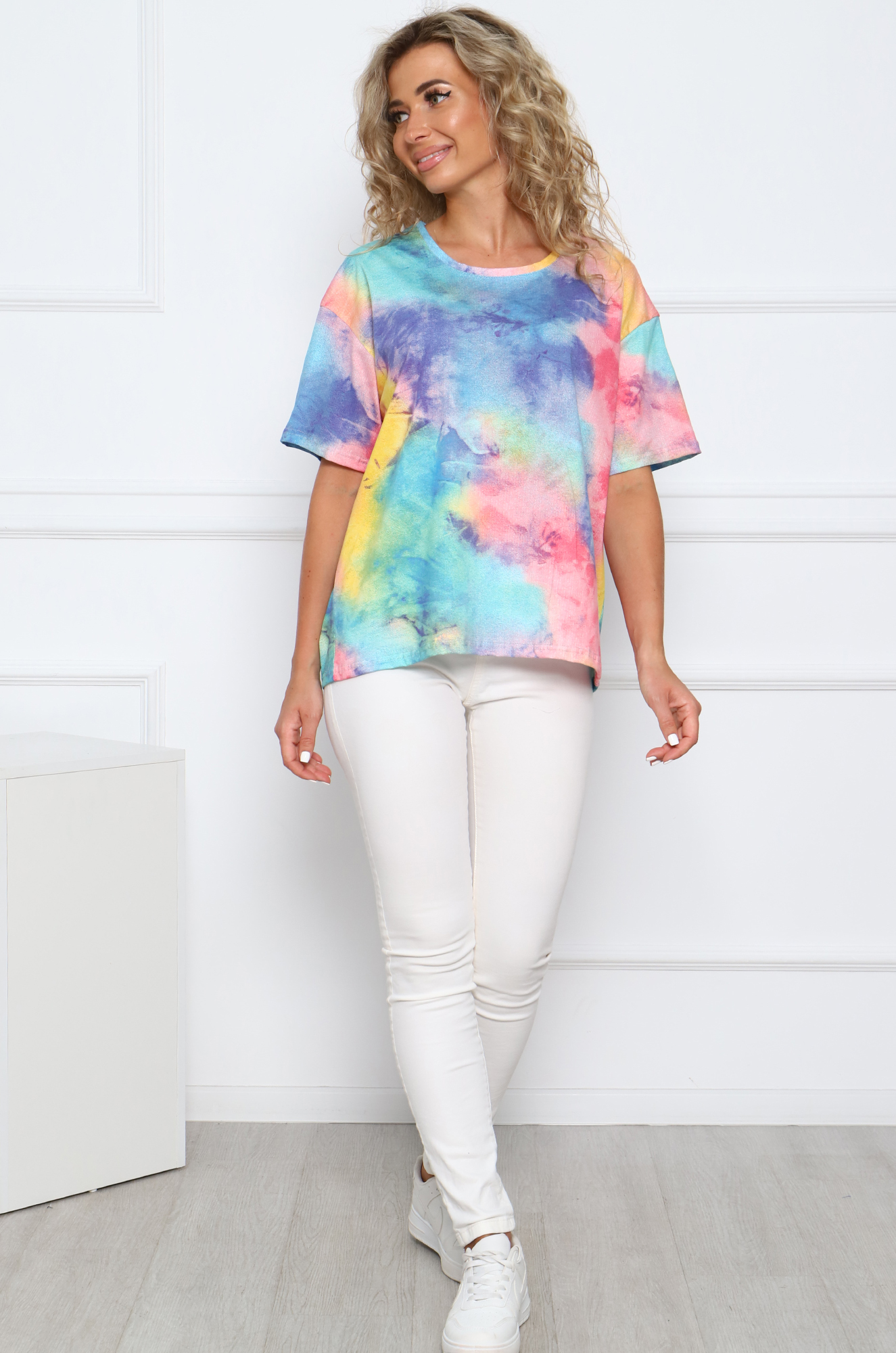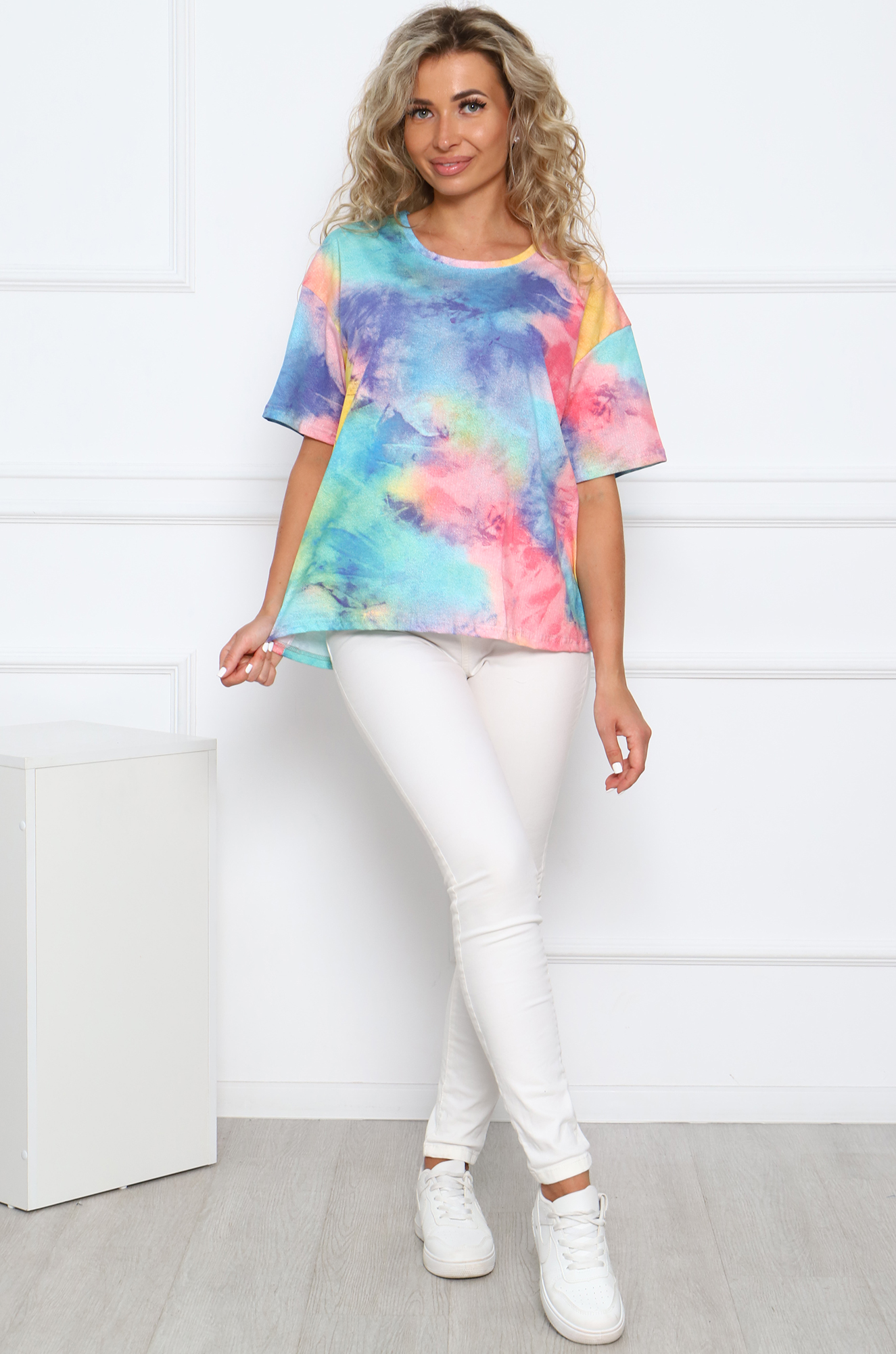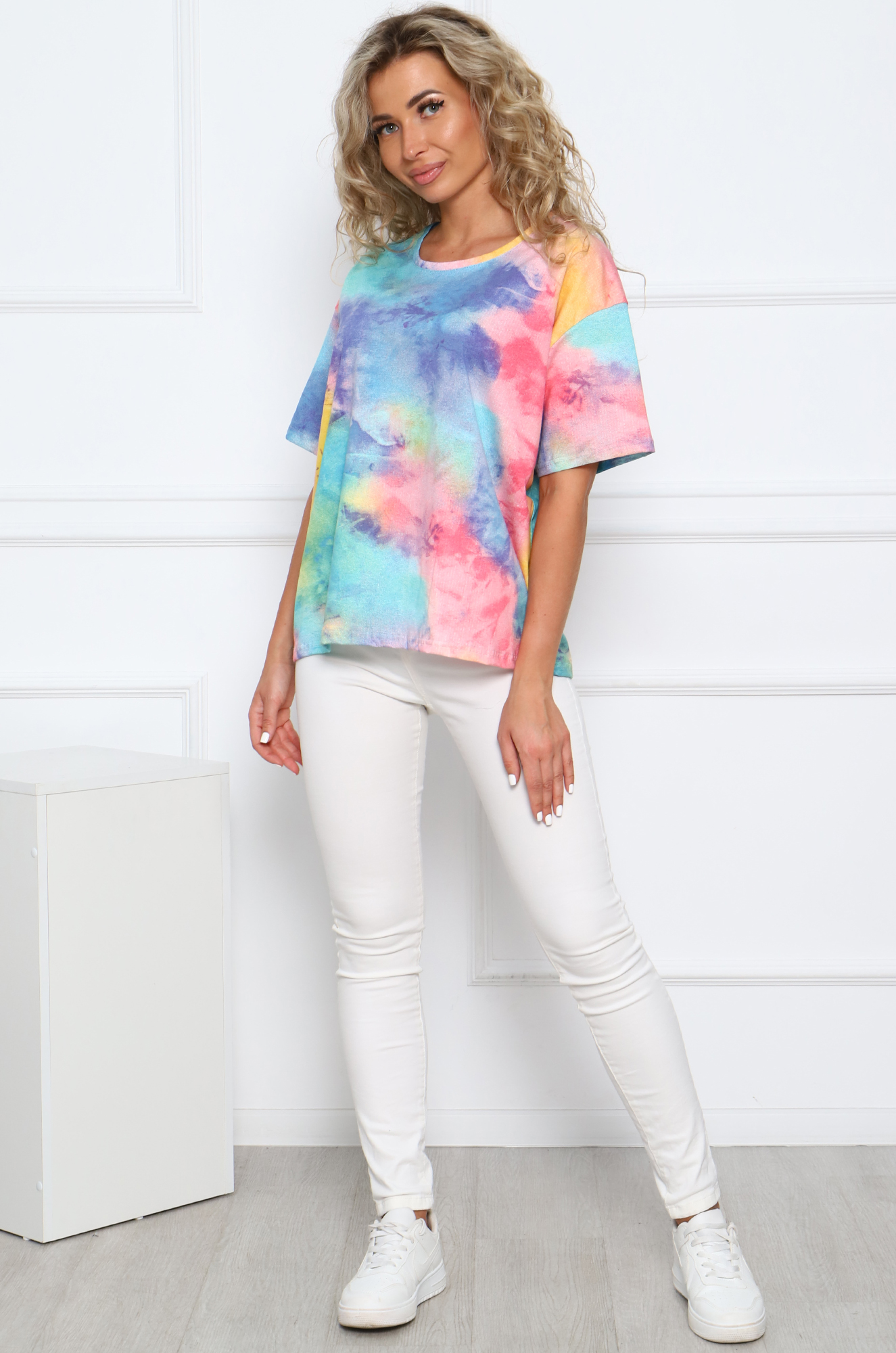 Летняя яркая футболка в стиле "оверсайз". Удлинённый рукав с подворотом, спущенное плечо, свободный крой - всё собрано в этой модели. С такой футболкой вы создадите модный образ на каждый день! Она отлично смотрится с джинсами, шортами, юбками, леггинсами и велосипедками.