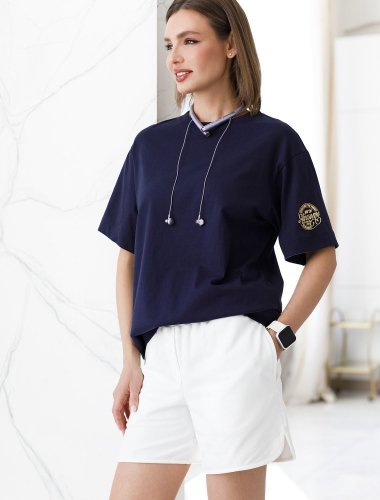 Оверсайз футболка темно-синего цвета выполнена из премиального 100% хлопка плотностью 140 Г/м2. Главная особенность этого изделия — тонкое кулирное полотно, которое легче и воздушнее стандартного варианта. Благодаря своей деликатной текстуре футболка идеально подходит для домашних образов и пижамных комплектов. Ткань отлично дышит, обеспечивая максимальный уют во время сна и отдыха. Особое внимание привлекает стильный принт в виде надписи на рукаве. Перевод надписи: Sometimes you forget Reminder You re Awesome So tnis is your - Иногда ты забываешь, как ты крута, так что это твое напоминание. Принт выполнен красками с устойчивым покрытием, который добавляет футболке оригинальности и позволяет выразить индивидуальность. Свободный крой футболки дарит удобство и не стесняет движений, что делает ее идеальной для повседневной носки или активного отдыха, подчеркивает современный взгляд на моду. Подойдет девушкам и женщинам на любую фигуру, вы будете чувствовать себя в ней уверенно и комфортно. Отлично впишется в гардероб благодаря универсальному дизайну, который легко сочетать с любыми низами.