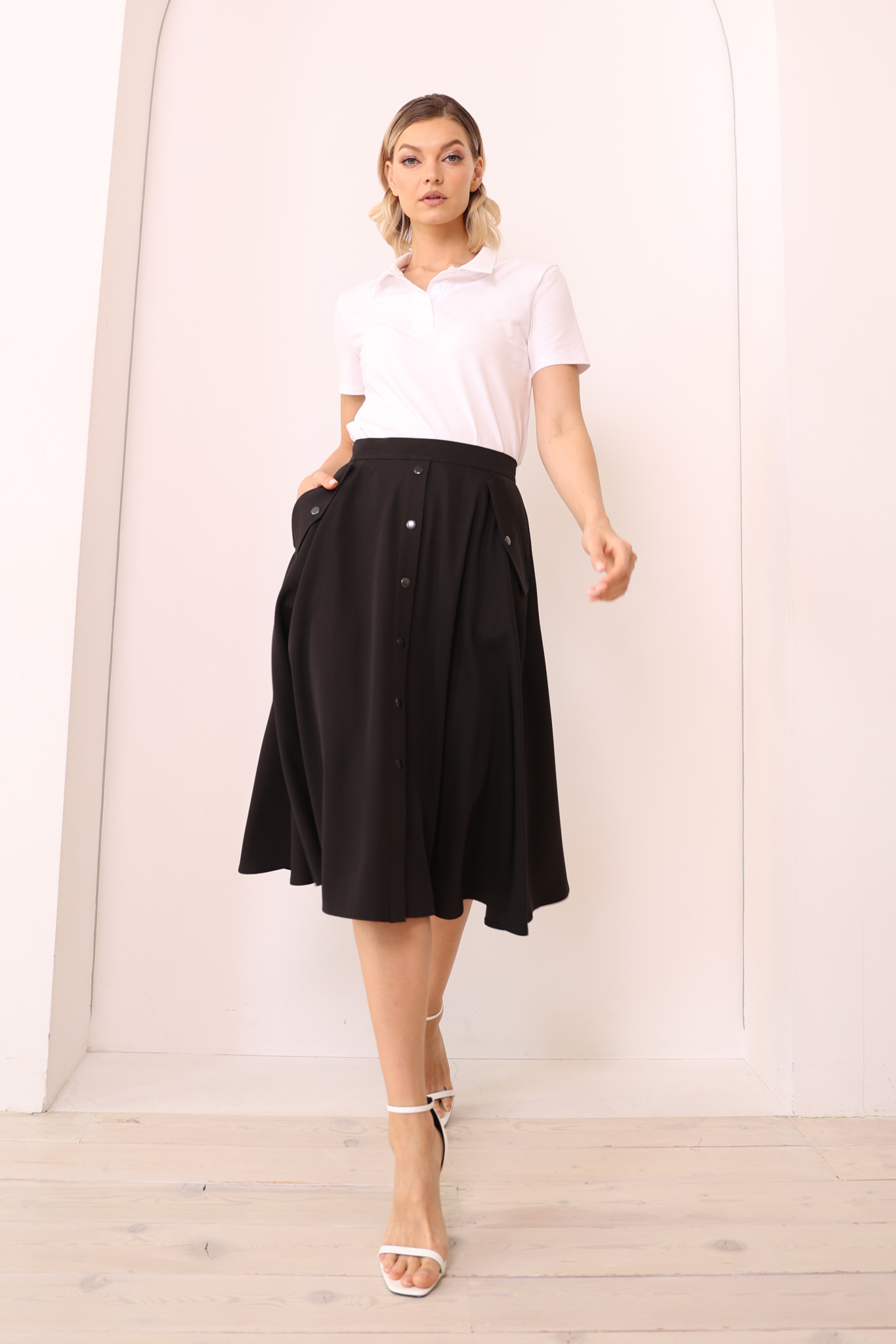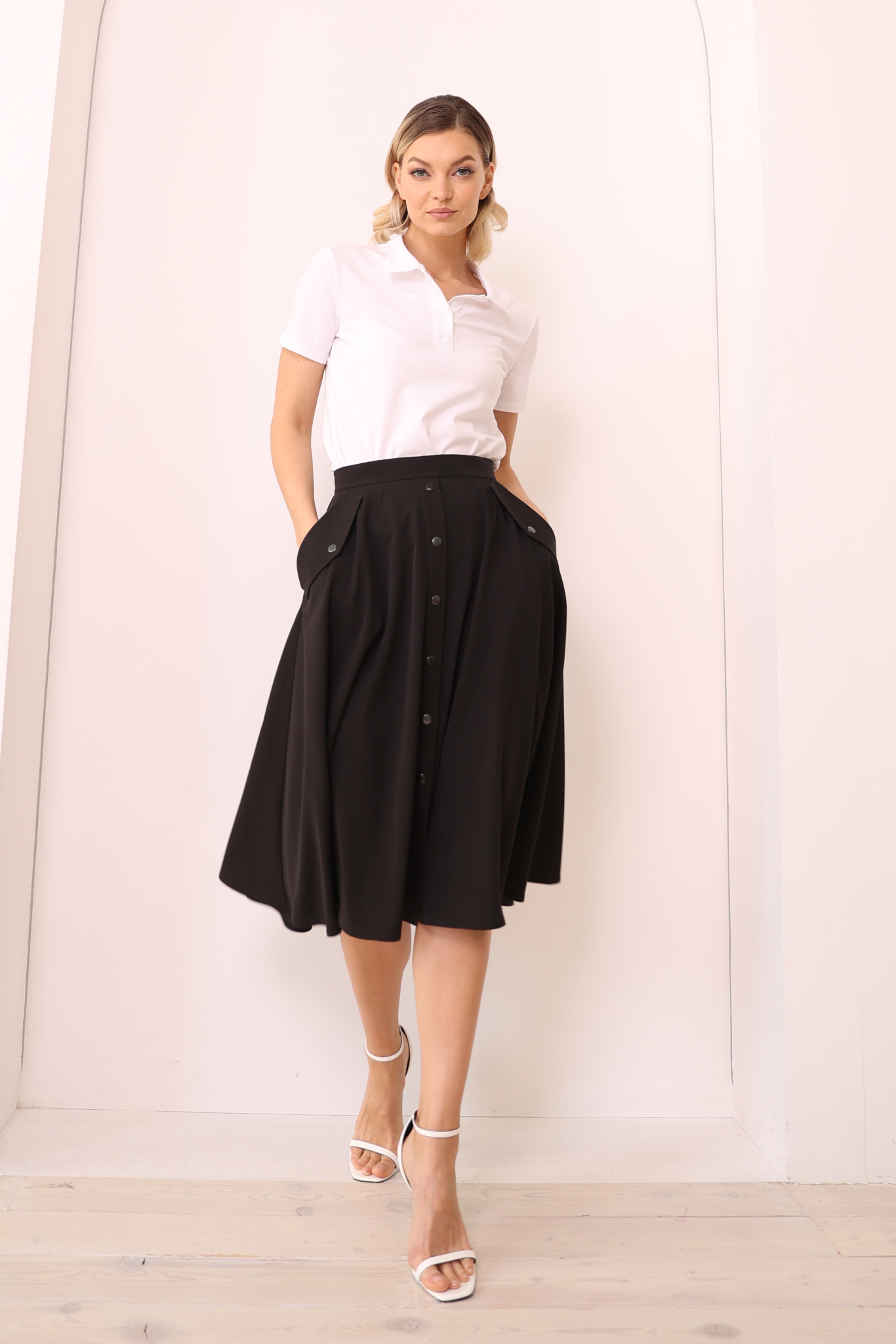 Параметры модели: 175 см, грудь 86 см, талия 66 см, бедра 96 см.