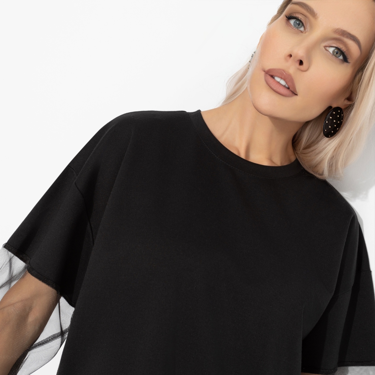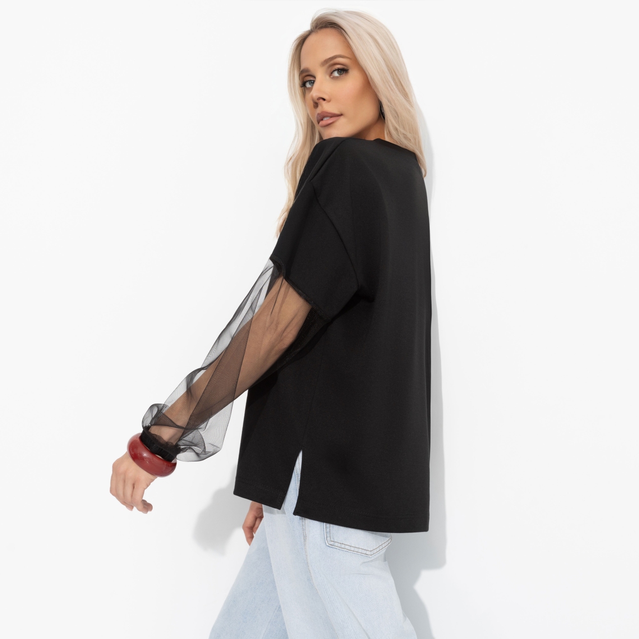 Заказывали мгновенное преображение из комфортного образа в стильный? Прозрачные рукава добавляют ноту смелой чувственности, не жертвуя при этом непринуждённой эстетикой. Футболка легко сочетается с кожаными брюками для вечеринки или с джинсами для повседневного шика. Футболка свободного кроя. Часть рукавов оформлена тонкой сеткой. Манжеты рукавов прошиты из основного материала. Линия плеча спущена. Деликатные разрезы по бокам изделия.