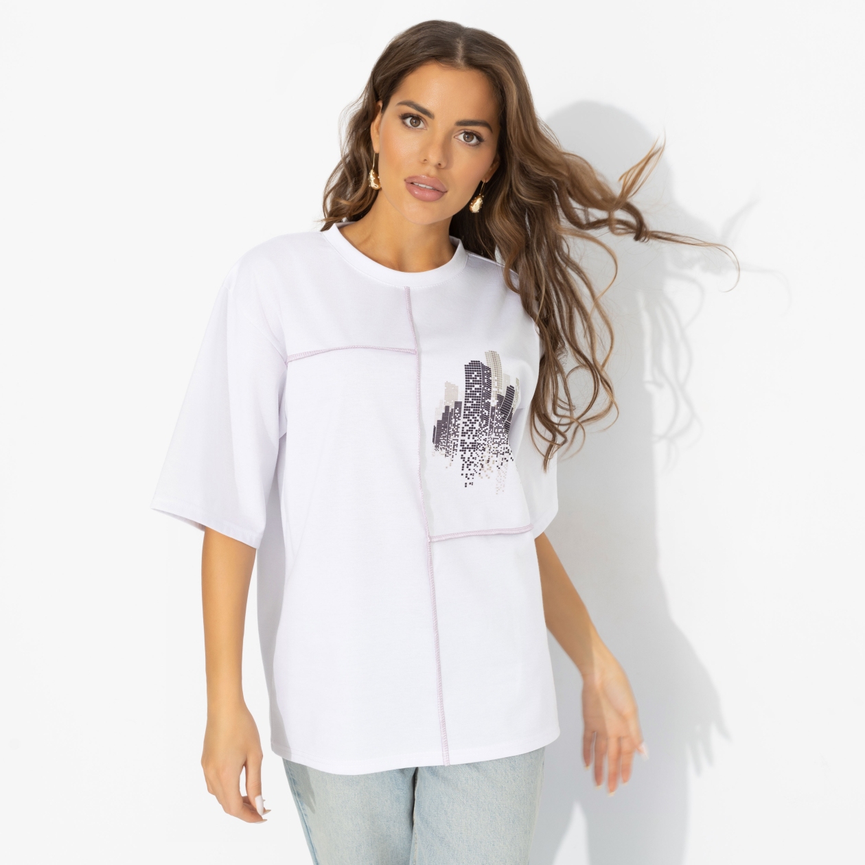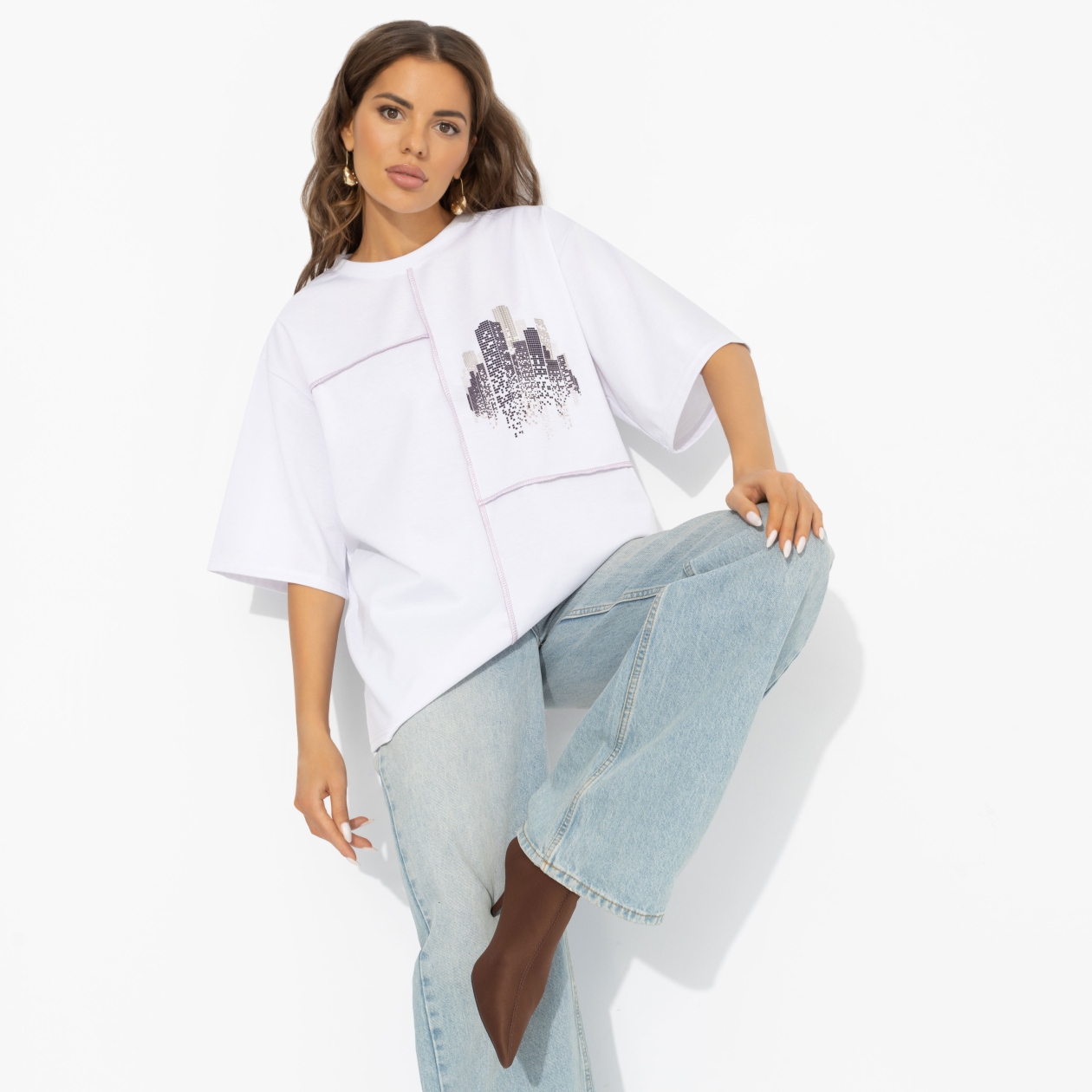 Двигйся в ритме мегаполиса! Графичный принт небоскрёбов и контрастные декоративные швы на футболке напоминают о ночном городе, который никогда не засыпает. Наденьте её с джинсами, брюками карго или мини‑юбкой – и вы уже в такт улицам, огням и бесконечному движению большого города. Свободный крой и мягкий трикотаж обеспечивают комфорт в течение всего дня, а урбанистичный рисунок добавляет образу модной динамики. В этой футболке одинаково органично появиться и в офисе с кроссовками, и на вечерней прогулке по центру, когда город превращается в вашу личную декорацию.