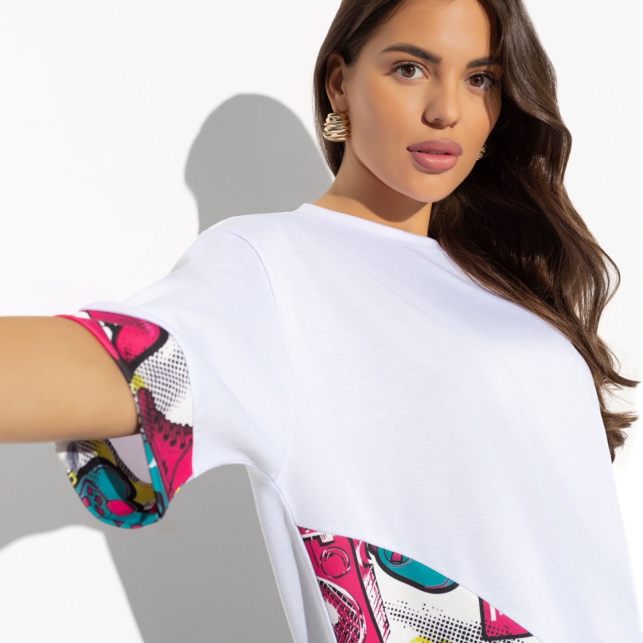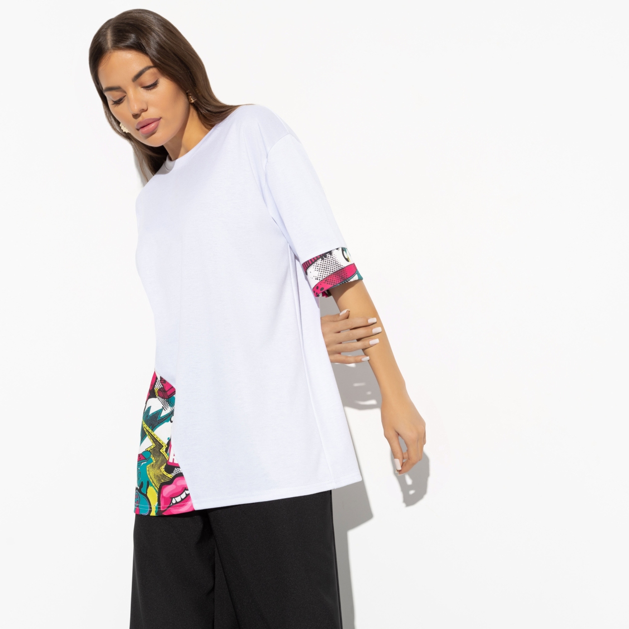 Между ранним утром буднего дня и ранним утром выходного есть одно отличие – скорость ваших перемещений. Если это суббота, не бегите готовить омлет и укладывать волосы, надевайте футболку CHARUTTI и отправляйтесь на завтрак в самую красивую кофейню города. Футболка свободного кроя. Длина изделия ниже линии бедра. Яркий принт вшит.