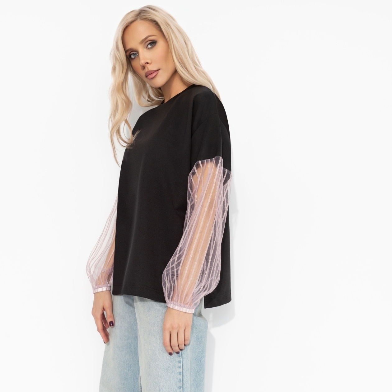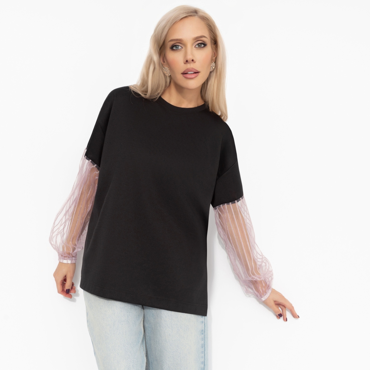 Футболка ЧАРУТТИ с акцентными длинными рукавами – идеальное воплощение дерзкого женского настроения. Мягкий, легкий розовый цвет, словно намёк на нежность, вступает в диалог фундаментальным цветом и кроем основной части. Ажурные рукава, парящие как лепестки пиона, добавляют образу кокотства. При этом все то с вами знаем, кто здесь «сильный пол». Футболка свободного кроя. Рукава полупрозрачные, из гипюра. Деликатные разрезы по бокам изделия. Футболка хорошо смотрится на любом типе фигуры.