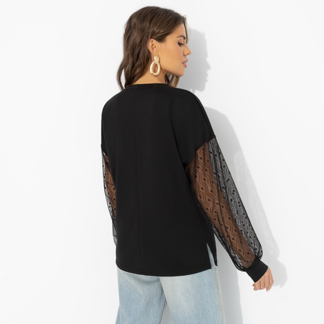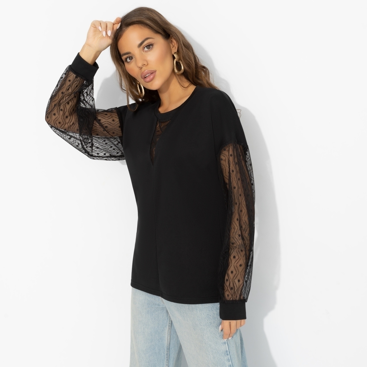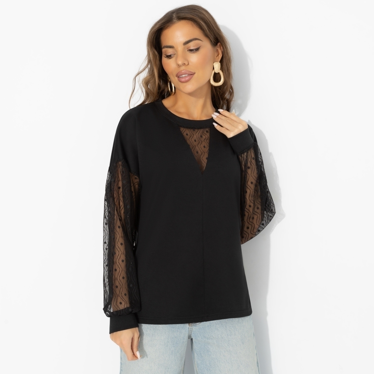 Та самая вещь «на всякий случай», которая превращает любой спонтанный вечер в продуманный выход. Полупрозрачный гипюр на рукавах и в зоне декольте делает базовый чёрный верх уместным и в баре, и на импровизированной after‑party – достаточно нанести помаду поярче и сменить кроссовки на стильные ботильоны. Мягкий и тактильный трикотаж отвечает за комфорт, а вставки из эластичного гипюра добавляют наряду вечернего настроения. С джинсами, кожаными брюками или мини‑юбкой эта футболка выручит в ситуации, когда планы внезапно меняются, а идти на компромисс со стилем совсем не хочется.