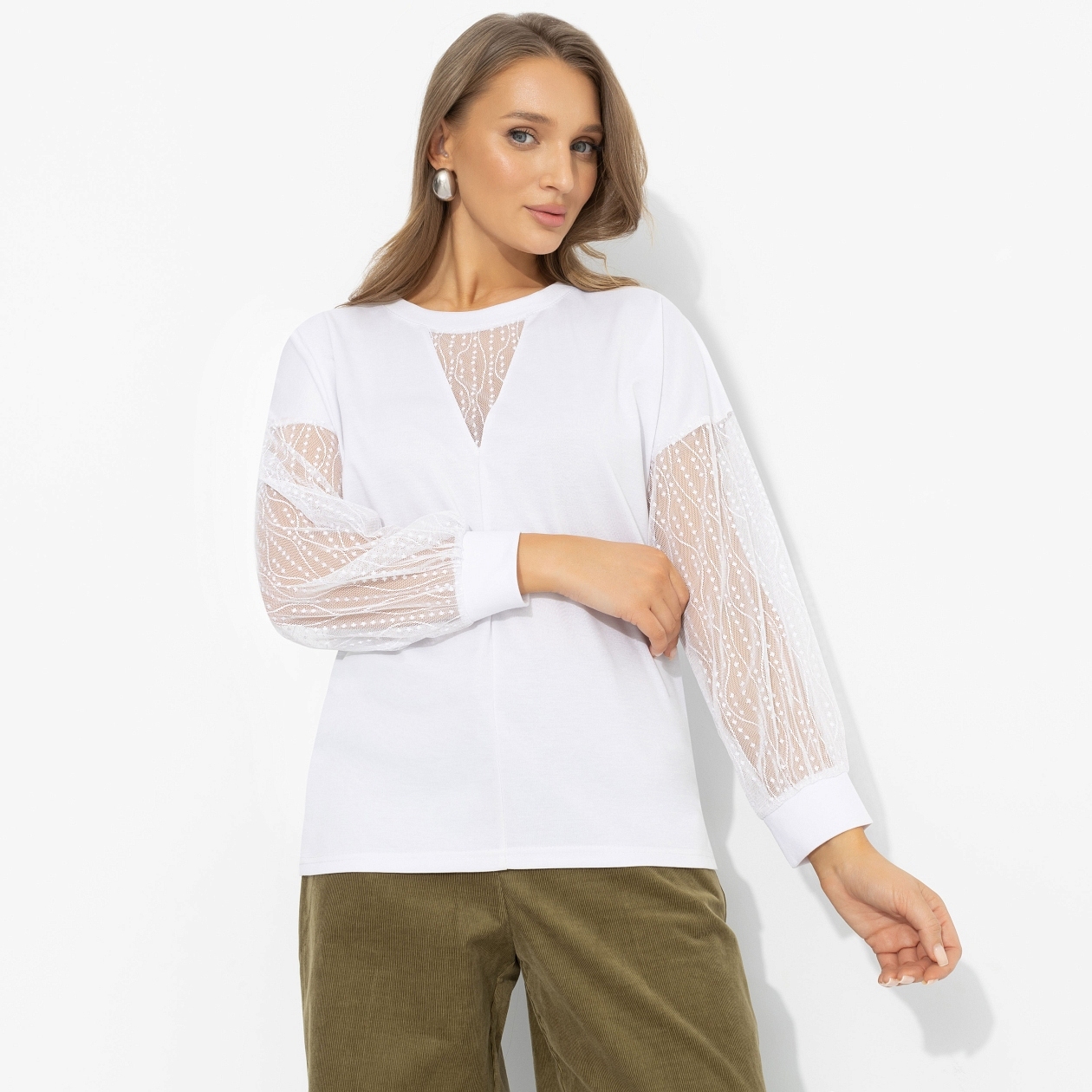 Что выбрать – комфорт или очарование? В случае с футболкой «Нет компромиссам» – и то и другое. Белая футболка станет уверенной базой с характером: чистый цвет и прозрачные акценты. Добавьте джинсы или брюки – и образ на каждый день готов. Модель прямого силуэта с добавлением эластана. Рукава и акцентная деталь из нежно просвечивающего гипюра-стрейч. Оставь компромиссы – выбери себя!