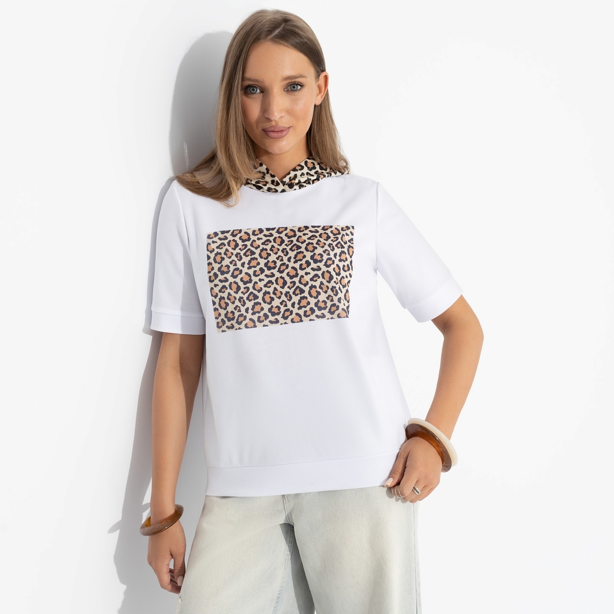 Если вы любите леопардовый принт так же, как дизайнеры CHARUTTI, то будьте готовы к экспериментам. Акцентом футболки стал леопардовый капюшон для оригинальных стилистических решений. Удлиненный фасон позволяет экспериментировать с образами. Принт напечатан на материале.