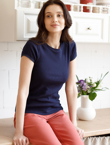 Футболка темно-синего цвета с круглым вырезом из фактурного трикотажа в рубчик идеально сочетается с повседневным стилем и подходит для домашней носки или отдыха. Мягкое полотно из хлопка обеспечивает максимальный комфорт даже в течение длительного времени. Особенность этого изделия — эластичная структура ткани, благодаря чему она хорошо тянется и подстраивается под особенности фигуры. Короткие рукава делают модель легкой и универсальной. На рукавах отделка нежным кружевом в тон основного цвета добавляет нотку романтичности. Футболка подойдет для девушек и женщин, которые ценят уют и удобство. Нежная ткань приятна к телу, не вызывает дискомфорта и позволяет коже дышать, что особенно важно в повседневной жизни. Футболка в мелкий рубчик полуприлегающего кроя визуально вытягивает силуэт и делает фигуру более стройной. Разнообразие размеров позволяет выбрать подходящий вариант для любых параметров, в том числе на большие размеры. Эта красивая футболка практична и незаменима для тех, кто ищет качественные и стильные вещи на каждый день.