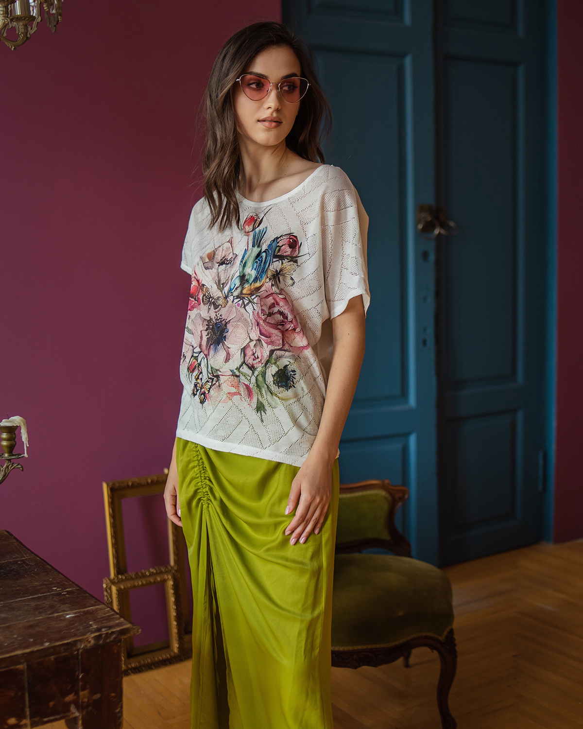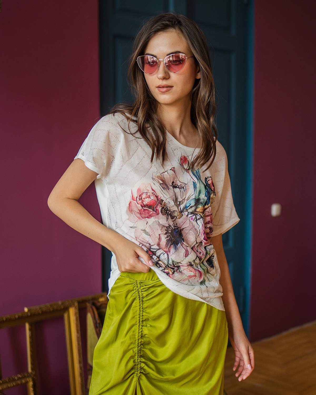 Кружевная футболка с принтом имеет ассиметричный крой, спинка немного длиннее, чем перед. Благодаря рукавам «кимоно» изделие подходит женщинам и с узкими плечами, и с широкими.