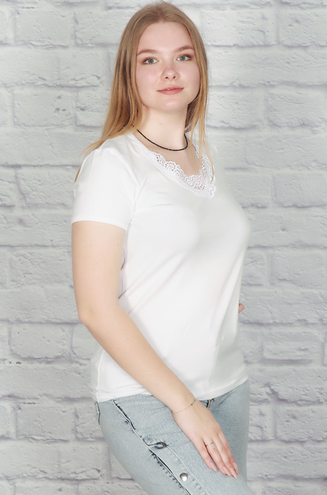 Женственная футболка классической модели. Горловина украшена кружевом. Смотрится очень изящно как с юбкой, так и с брюками.
