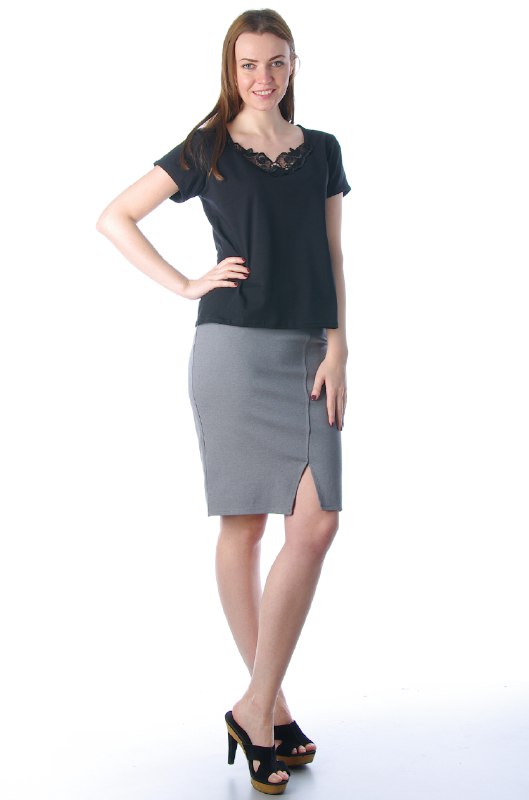 Женственная футболка классической модели. Горловина украшена кружевом. Смотрится очень изящно как с юбкой, так и с брюками.