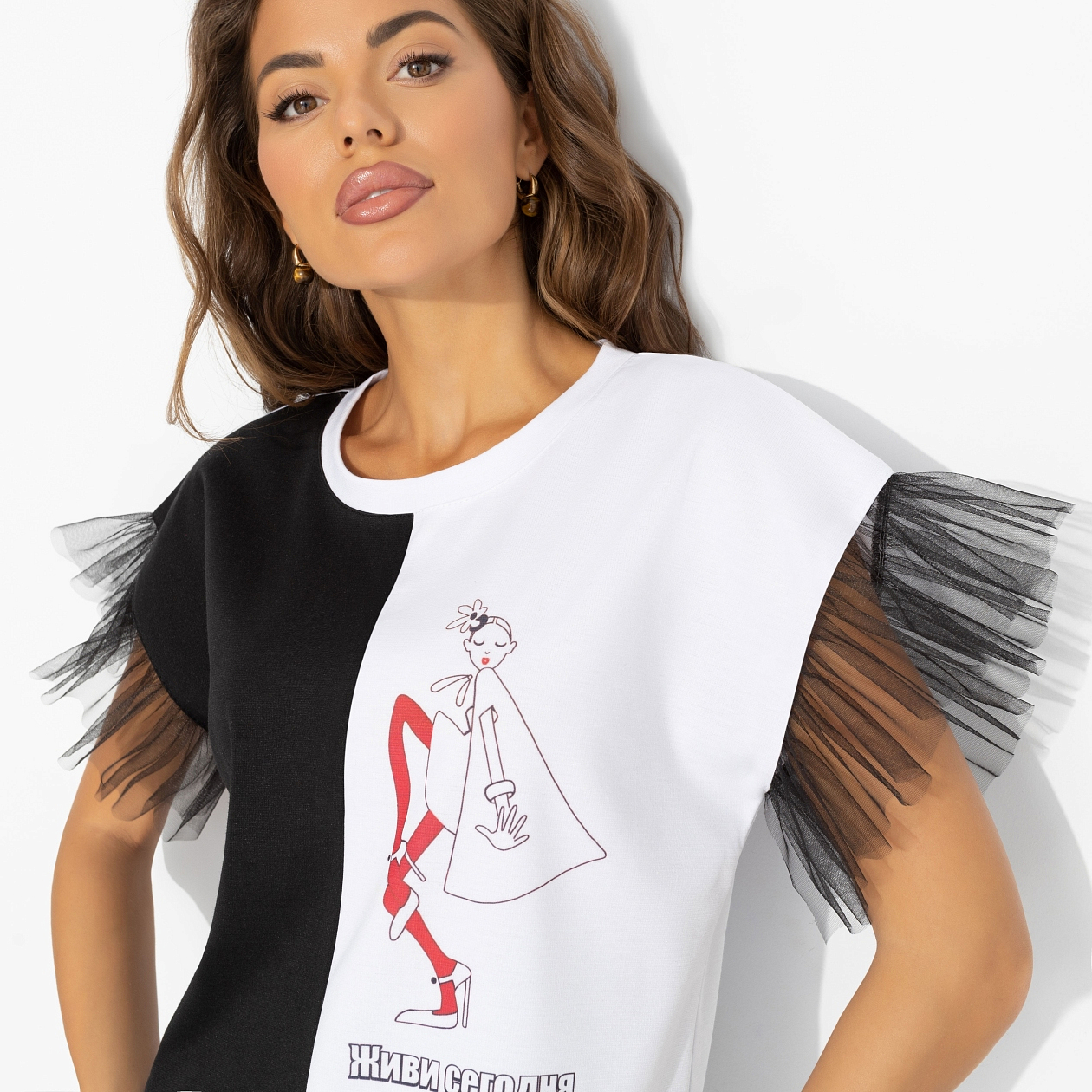 Искра, буря, безумие… В такой футболке-заявлении от ЧАРУТТИ вы всегда ‒ то самое первое впечатление: контрасты, акцентные рукава и стиль, который запоминается с первой секунды. Живи сегодня! Футболка из трикотажа «милано» с черно-белым колорблоком и рукавами из фатина. То, что нужно для событий и встреч, где важна харизма. Надпись на изделии: «Живи сегодня!».