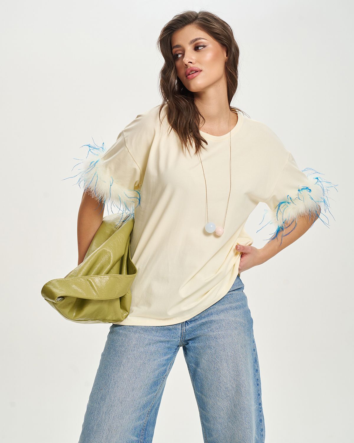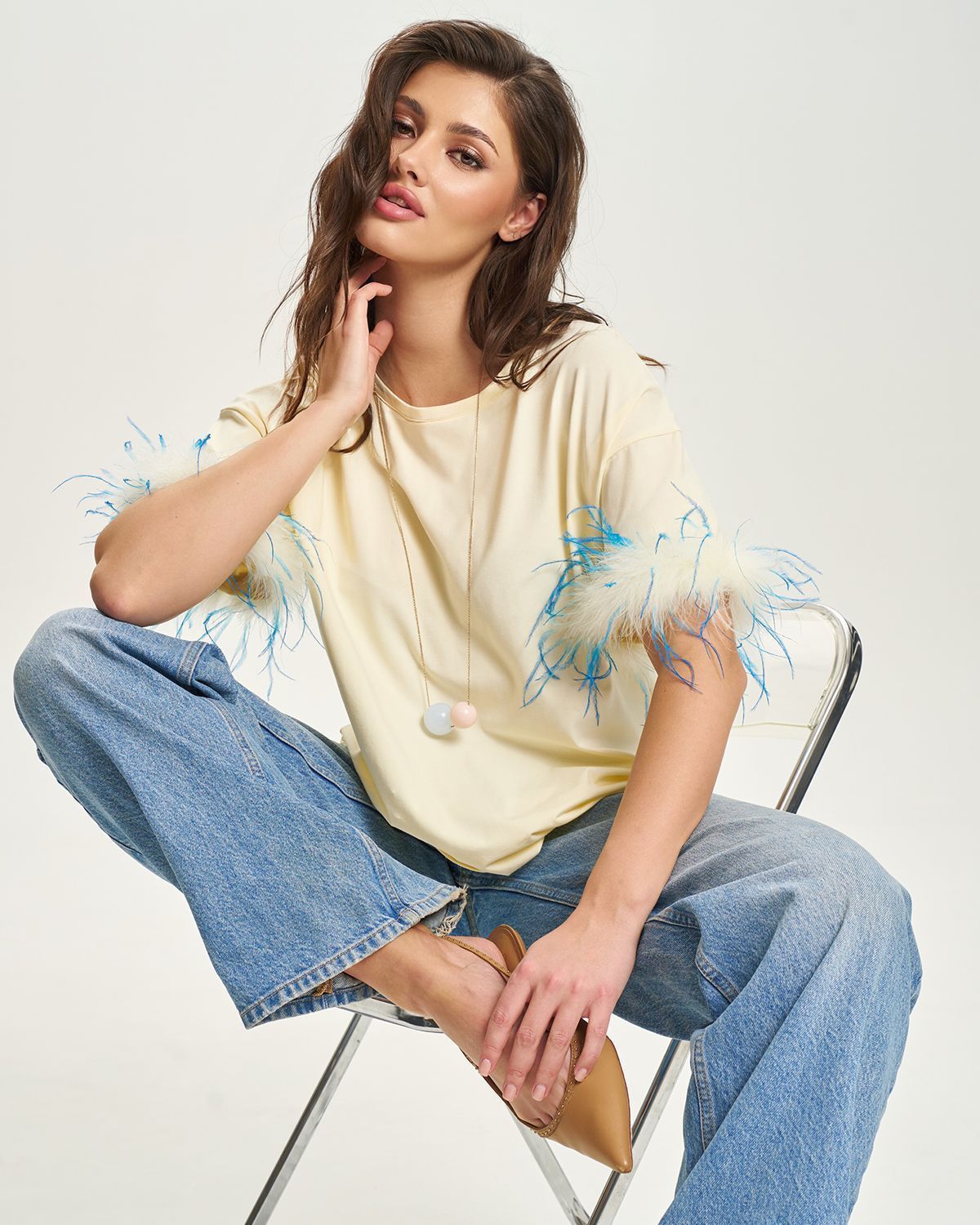 Футболка с перьями — экстравагантная находка для тех, кто следит за fashion индустрией. Роскошный тренд с мировых подиумов и из последних лукбуков таких модных брендов, как Bottega Venetta, The Attico, станет изюминкой вашего гардероба.