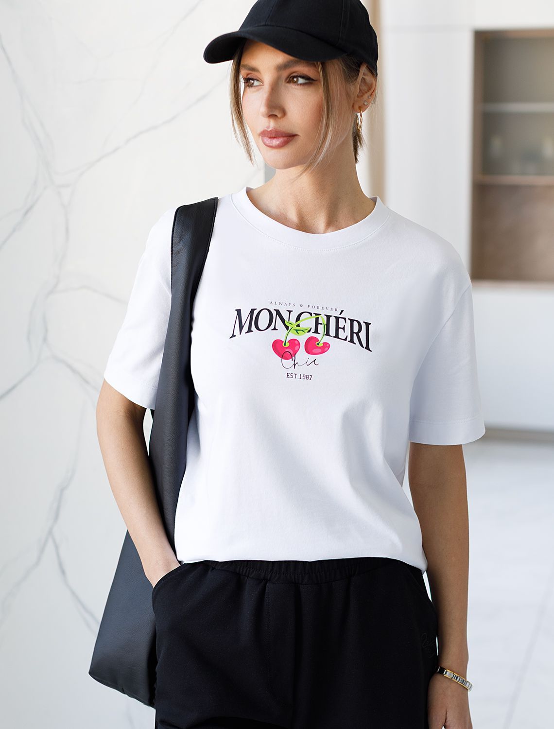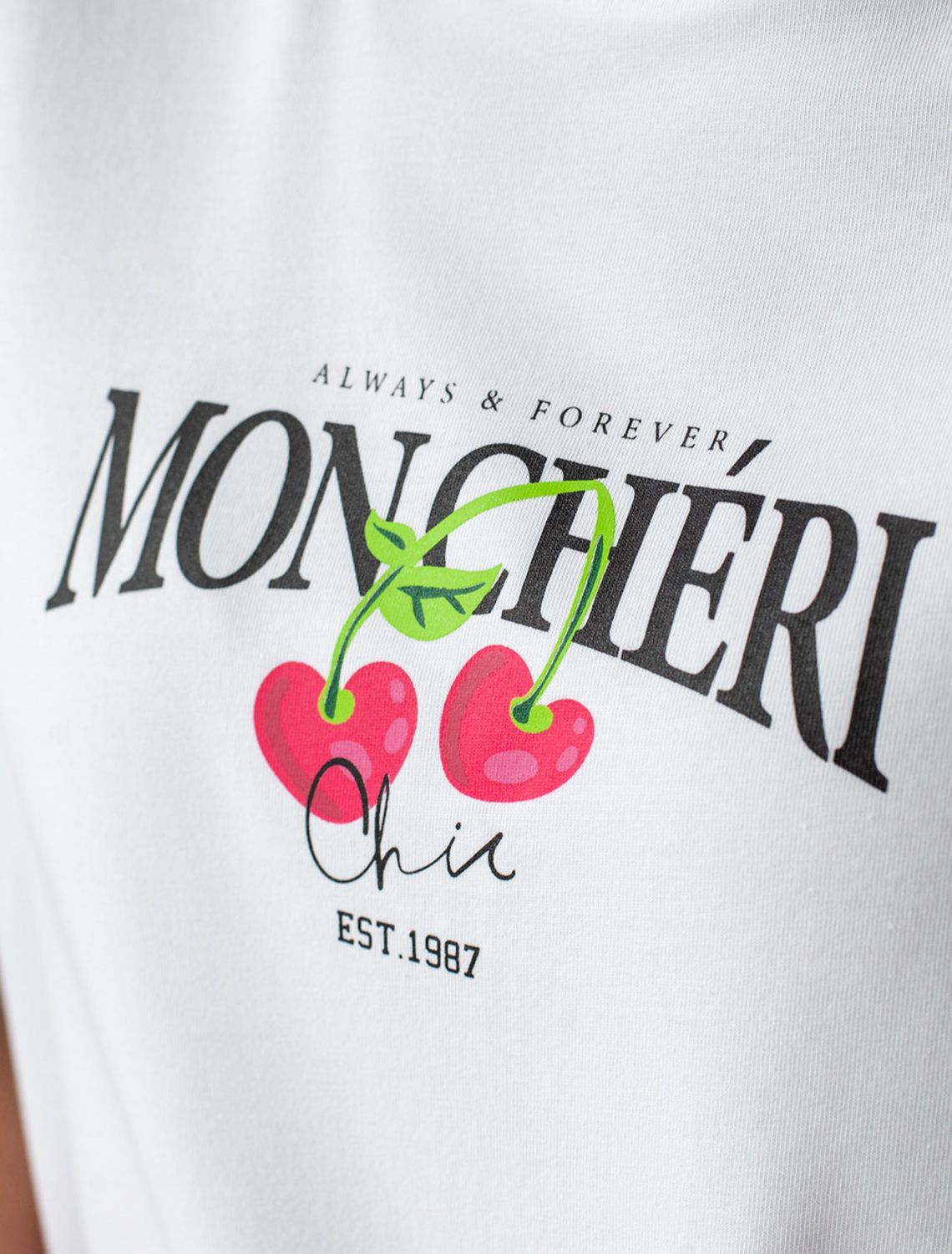 Особое внимание привлекает стильный принт в виде ягод вишни с минималистичной надписью. Перевод надписи Always and Forever Moncheri - Всегда и Навсегда Мончери. Принт выполнен красками с устойчивым покрытием, который добавляет изделию оригинальности и позволяет выразить индивидуальность.