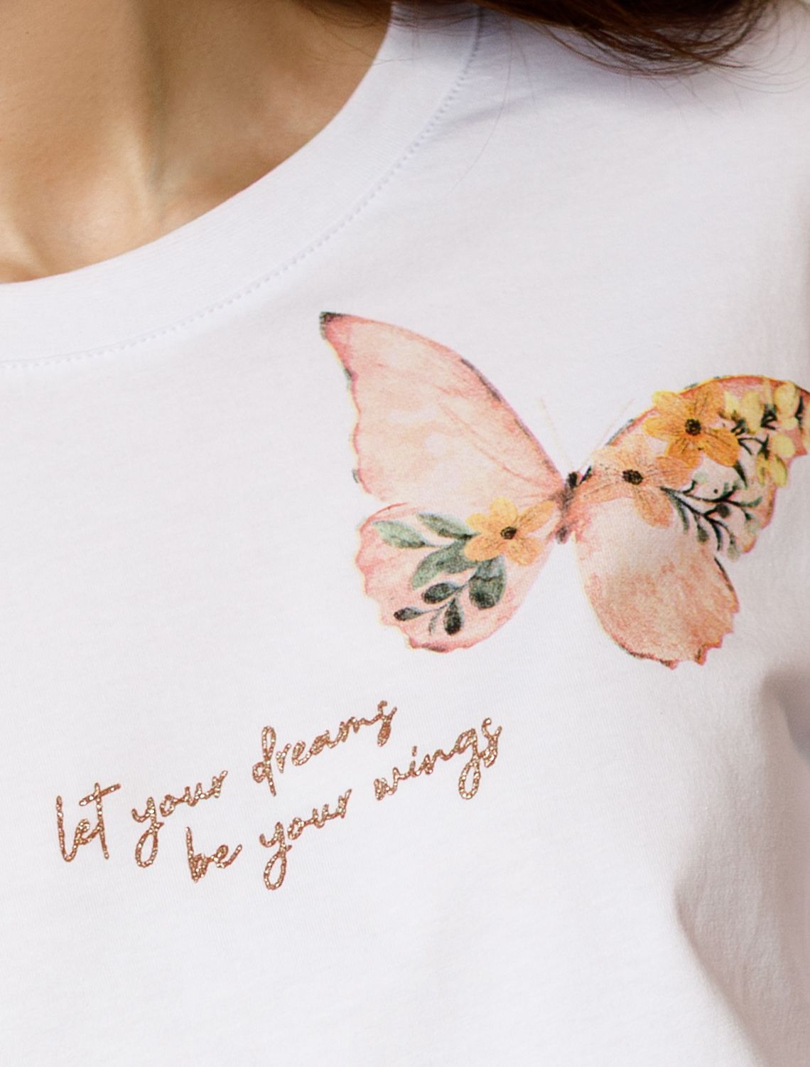 Особое внимание привлекает стильный принт в виде бабочки с минималистичной надписью. Перевод надписи Let your dreams be your wings - Пусть твои мечты станут твоими крыльями. Принт выполнен красками с устойчивым покрытием, который добавляет изделию оригинальности и позволяет выразить индивидуальность.