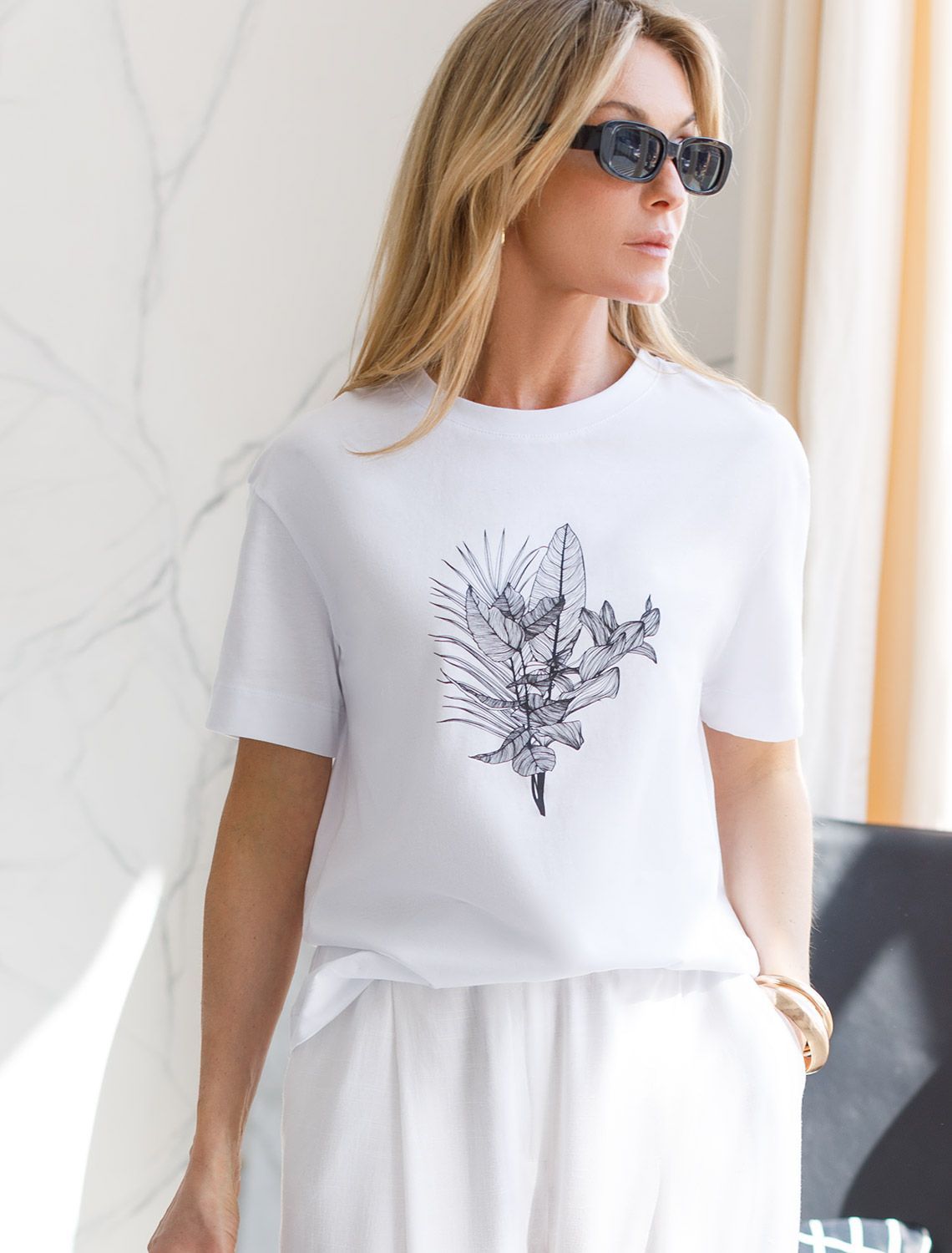 Футболка белого цвета выполнена из премиального 100% хлопка плотностью 140 Г/м2. Главная особенность этого изделия — тонкое кулирное полотно, которое легче и воздушнее стандартного варианта. Благодаря своей деликатной текстуре футболка идеально подходит для домашних образов и пижамных комплектов. Ткань отлично дышит, обеспечивая максимальный уют во время сна и отдыха. Особое внимание привлекает стильный принт контрастного цвета в виде тропических растений. Принт выполнен красками с устойчивым покрытием, который добавляет изделию оригинальности и позволяет выразить индивидуальность. Свободный крой футболки дарит удобство и не стесняет движений, что делает ее идеальной для повседневной носки или активного отдыха, подчеркивает современный взгляд на моду. Подойдет девушкам и женщинам на любую фигуру, вы будете чувствовать себя в ней уверенно и комфортно. Лаконичный современный принт делает изделие универсальным: можно создавать стильные образы для прогулок, встреч, занятий спортом и домашних дел. Базовая футболка подходит для любой ситуации и сочетается с разными элементами гардероба.