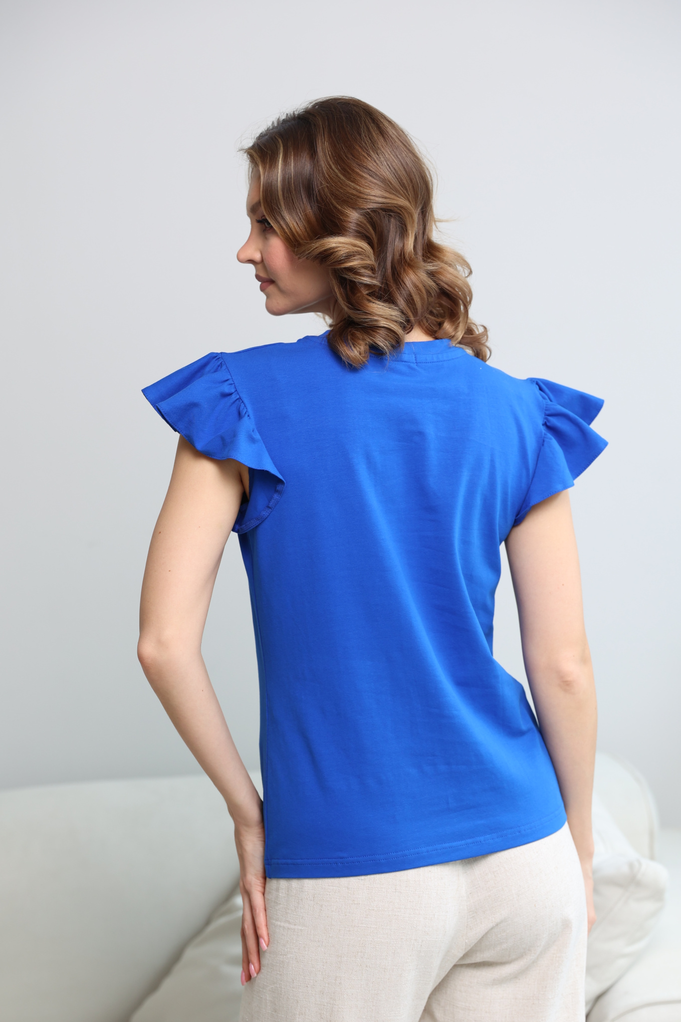 Футболка прямого силуэта с круглой горловиной и рукавом- крылышком. Выполнена из легкого приятного к телу трикотажа на основе хлопка с добавлением лайкры.