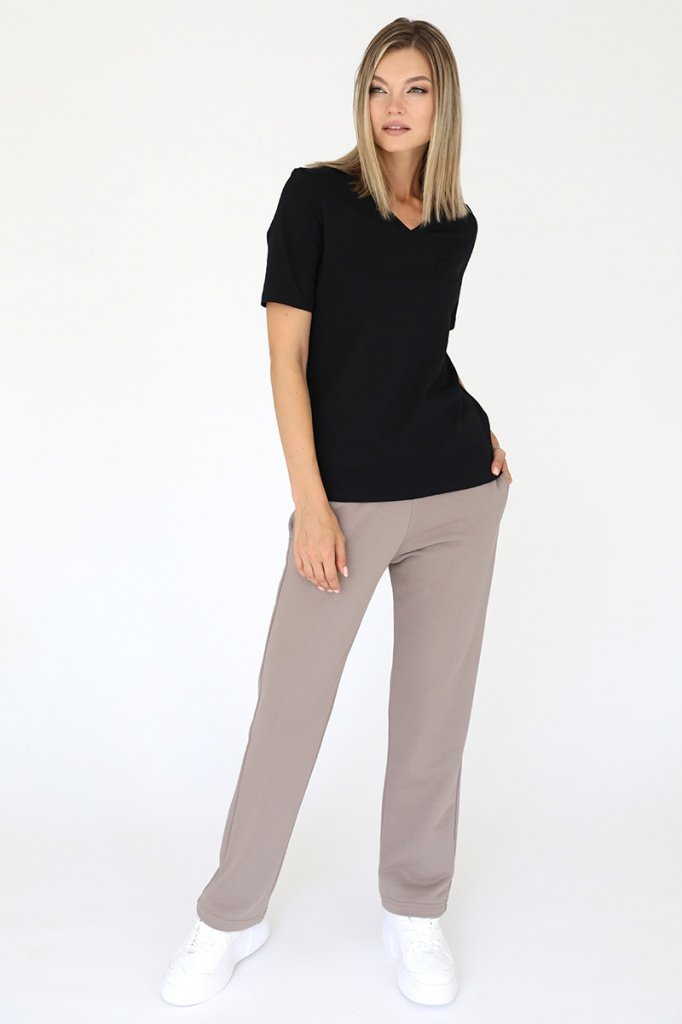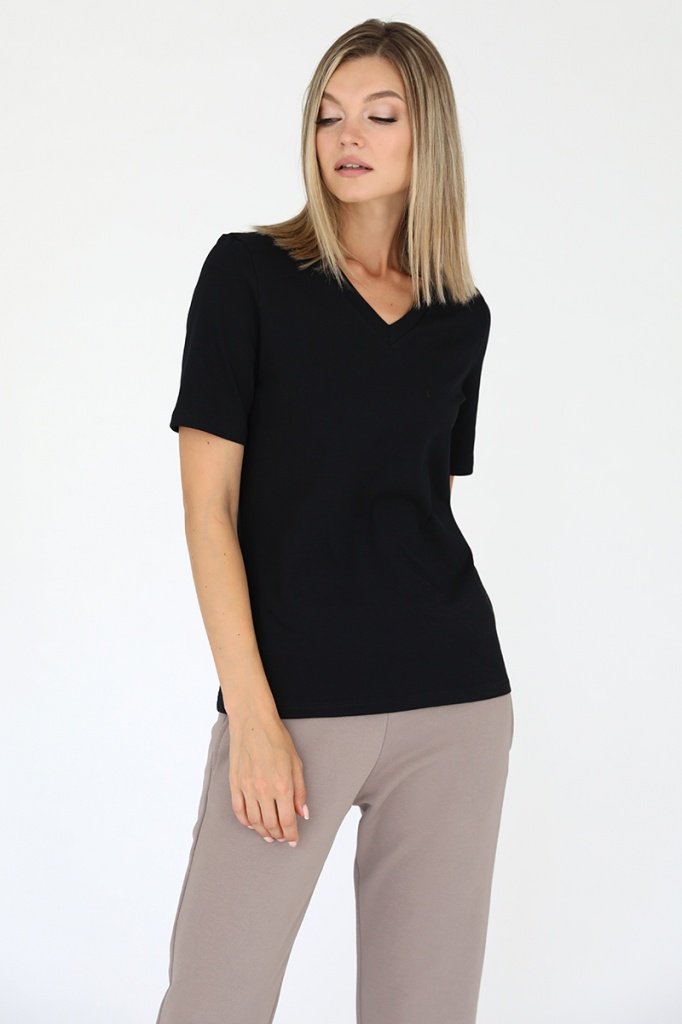 Футболка с V-образным вырезом. Прямой крой, классический короткий рукав с отстрочкой по низу. Футболка выполнена из легкого приятного к телу трикотажа на основе хлопка с добавлением лайкры.