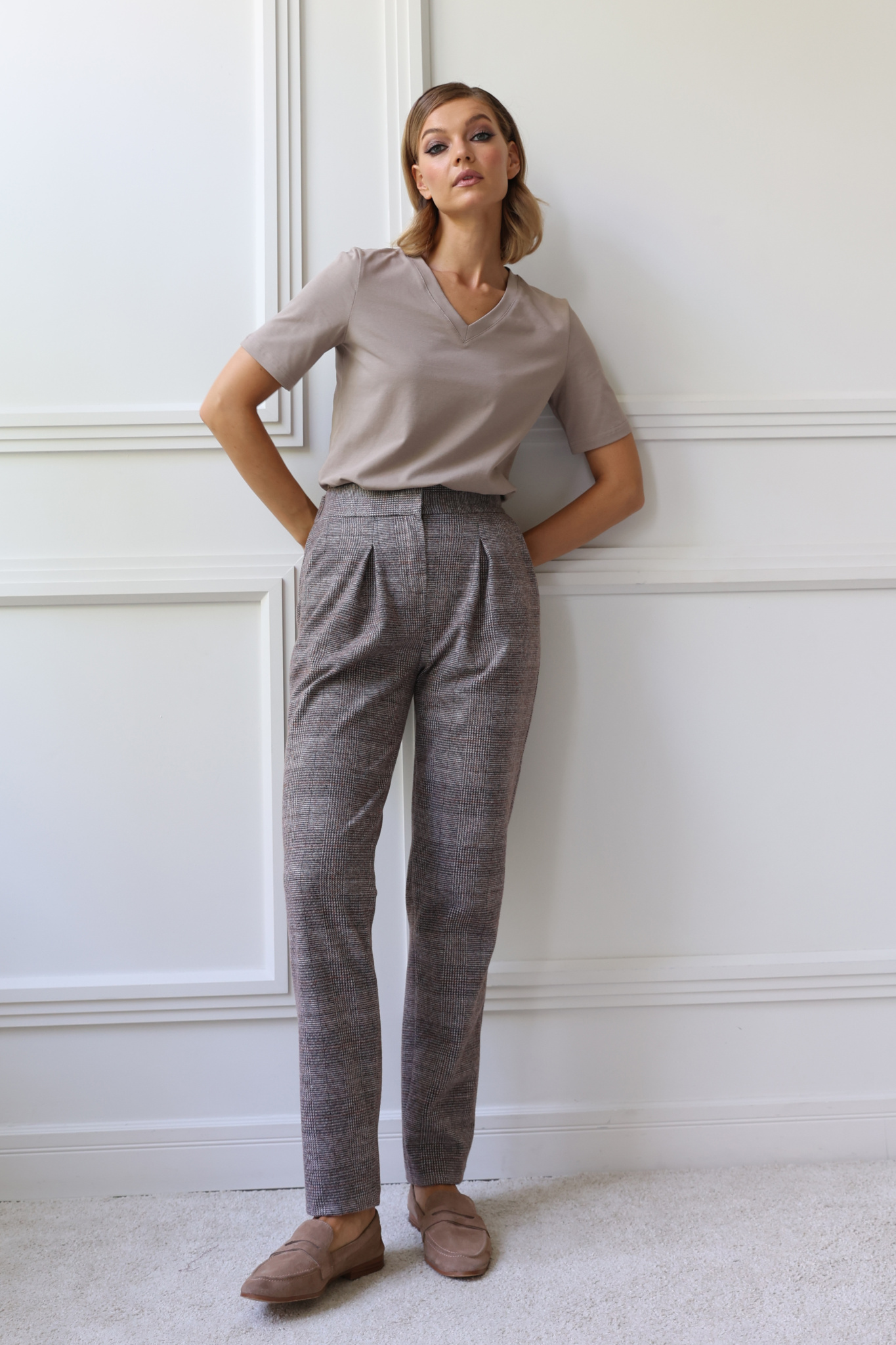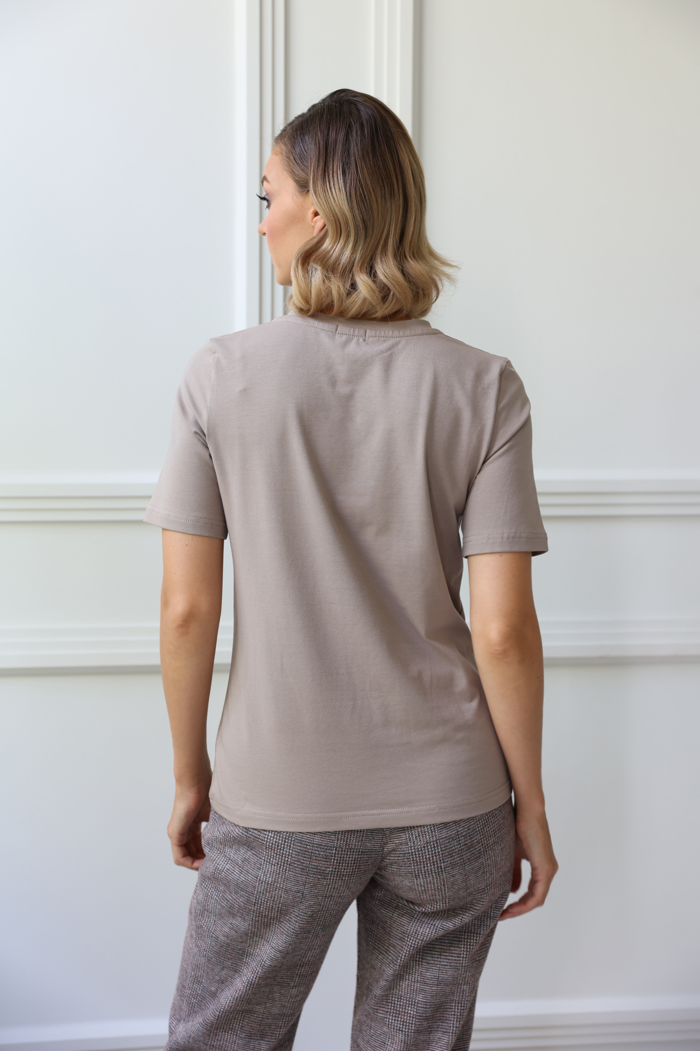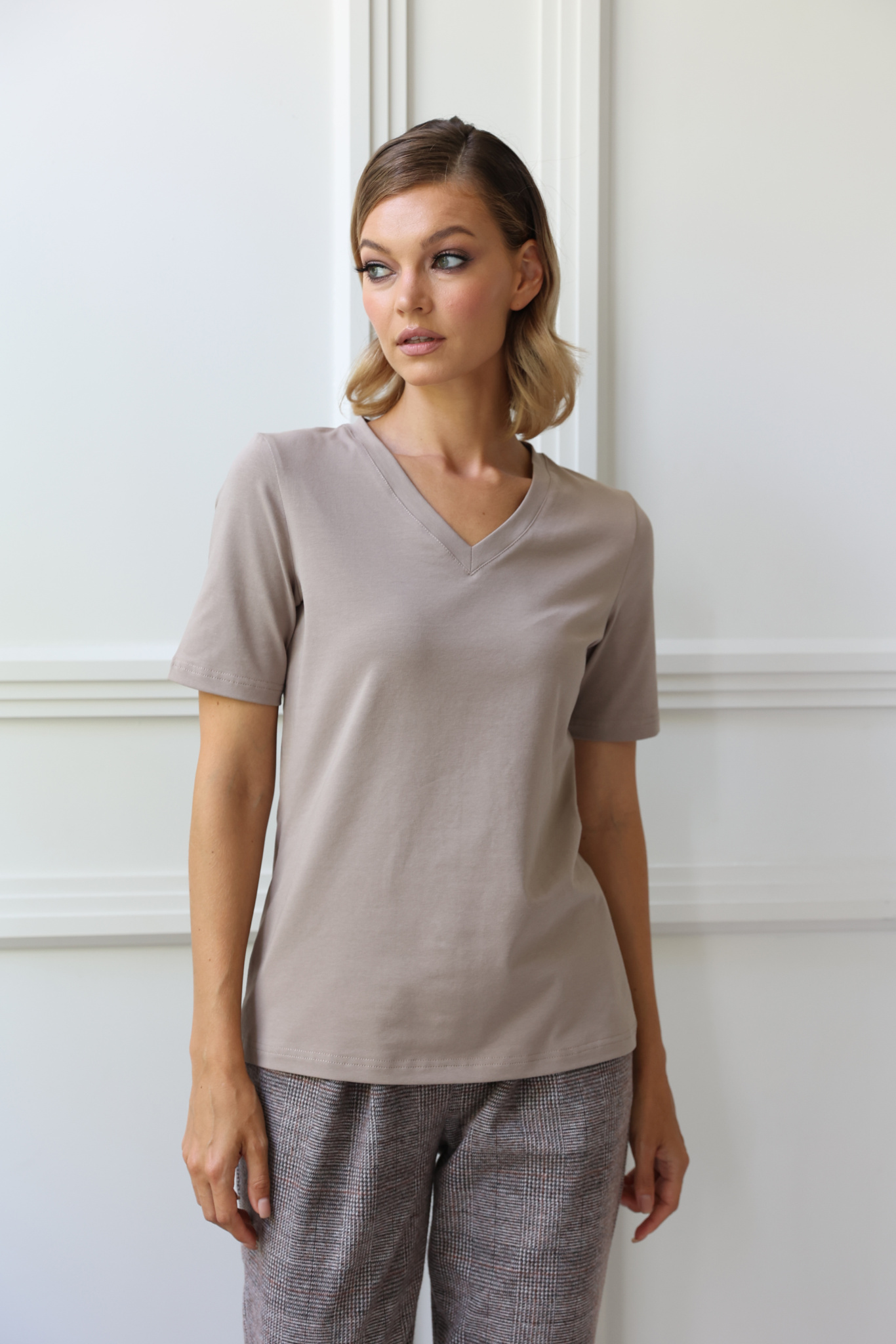 Футболка с V-образным вырезом. Прямой крой, классический короткий рукав с отстрочкой по низу. Футболка выполнена из легкого приятного к телу трикотажа на основе хлопка с добавлением лайкры.