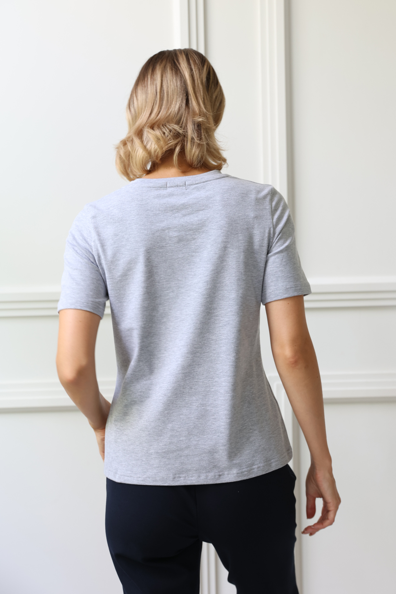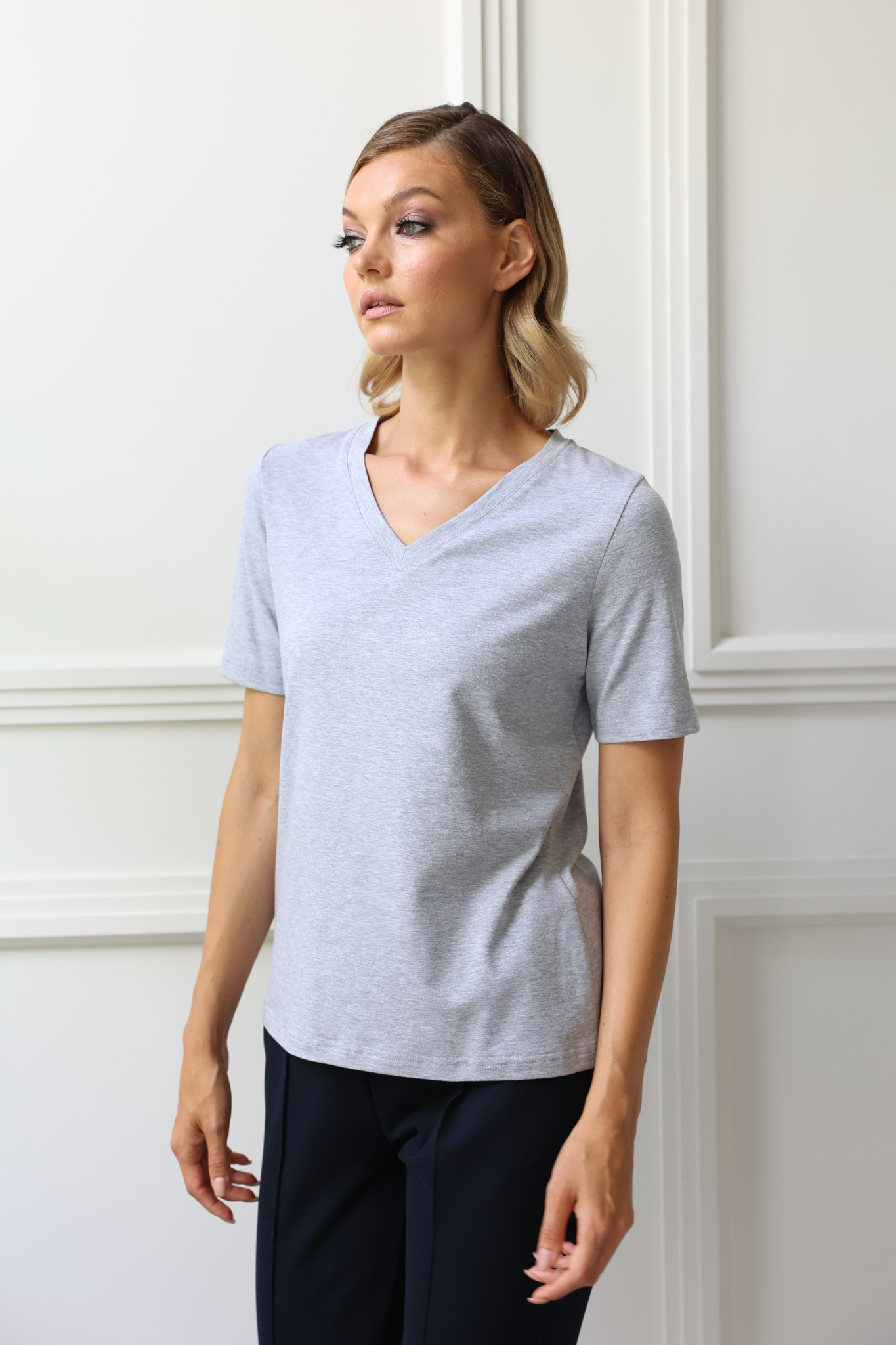 Футболка с V-образным вырезом. Прямой крой, классический короткий рукав с отстрочкой по низу. Футболка выполнена из легкого приятного к телу трикотажа на основе хлопка с добавлением лайкры.