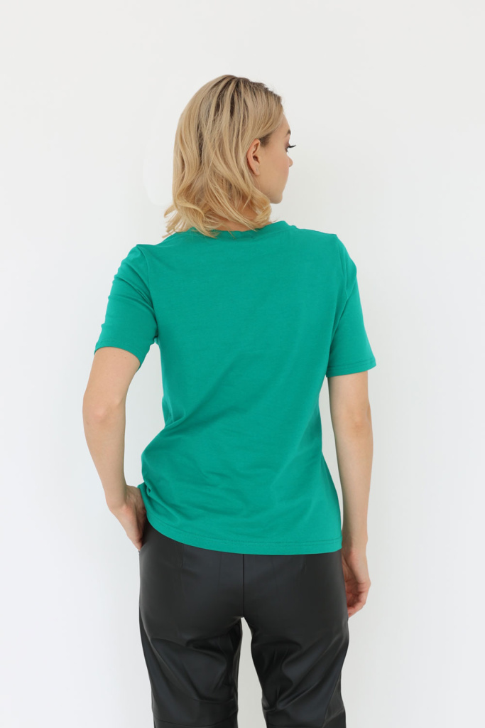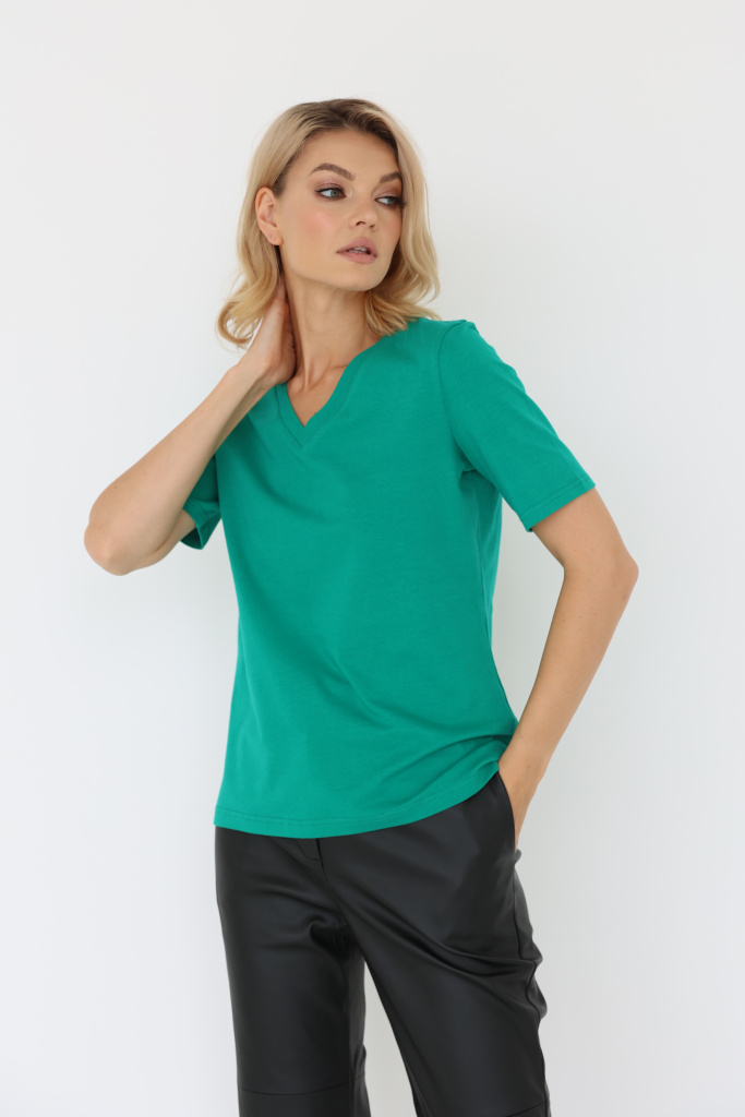 Футболка с V-образным вырезом. Прямой крой, классический короткий рукав с отстрочкой по низу. Футболка выполнена из легкого приятного к телу трикотажа на основе хлопка с добавлением лайкры.