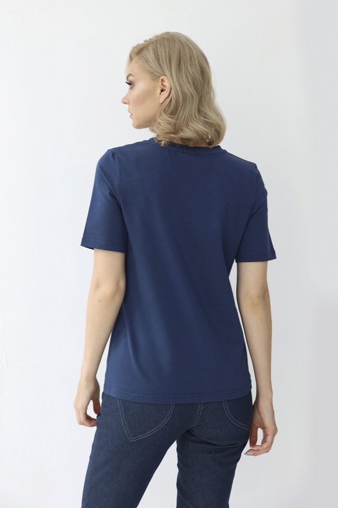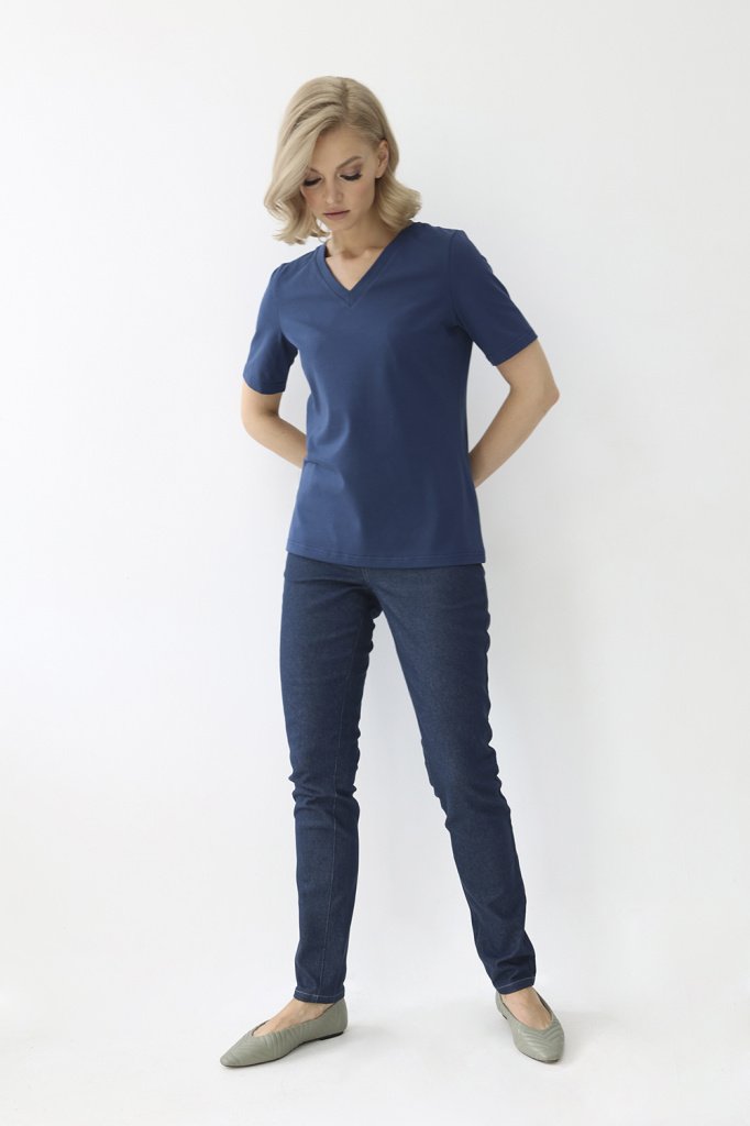 Футболка с V-образным вырезом. Прямой крой, классический короткий рукав с отстрочкой по низу. Футболка выполнена из легкого приятного к телу трикотажа на основе хлопка с добавлением лайкры.