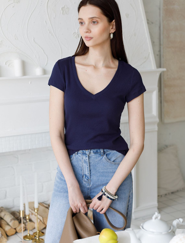 Футболка темно-синего цвета с V вырезом из фактурного трикотажа в рубчик. Особенность полотна - трикотаж кашкорсе удивительной мягкости, намного мягче стандартных вариантов, подходящий для расслабленных домашних и пижамных образов. Хлопок обеспечивает максимальный комфорт даже в течение длительного времени и позволяет коже дышать, а эластан в составе позволяет ткани подстраиваться под особенности фигуры. Короткие рукава делают модель легкой и универсальной. V-образный вырез красиво подчеркивает зону декольте, придавая образу утонченность и женственность, не открывая лишнего, сохраняя при этом комфорт и уверенность в себе. Футболка подойдет для девушек и женщин, которые ценят уют и удобство. Футболка в мелкий рубчик полуприлегающего кроя визуально вытягивает силуэт и делает фигуру более стройной. Разнообразие размеров позволяет выбрать подходящий вариант для любых параметров, в том числе на большие размеры. Эта красивая футболка практична и незаменима для тех, кто ищет качественные и стильные вещи на каждый день.