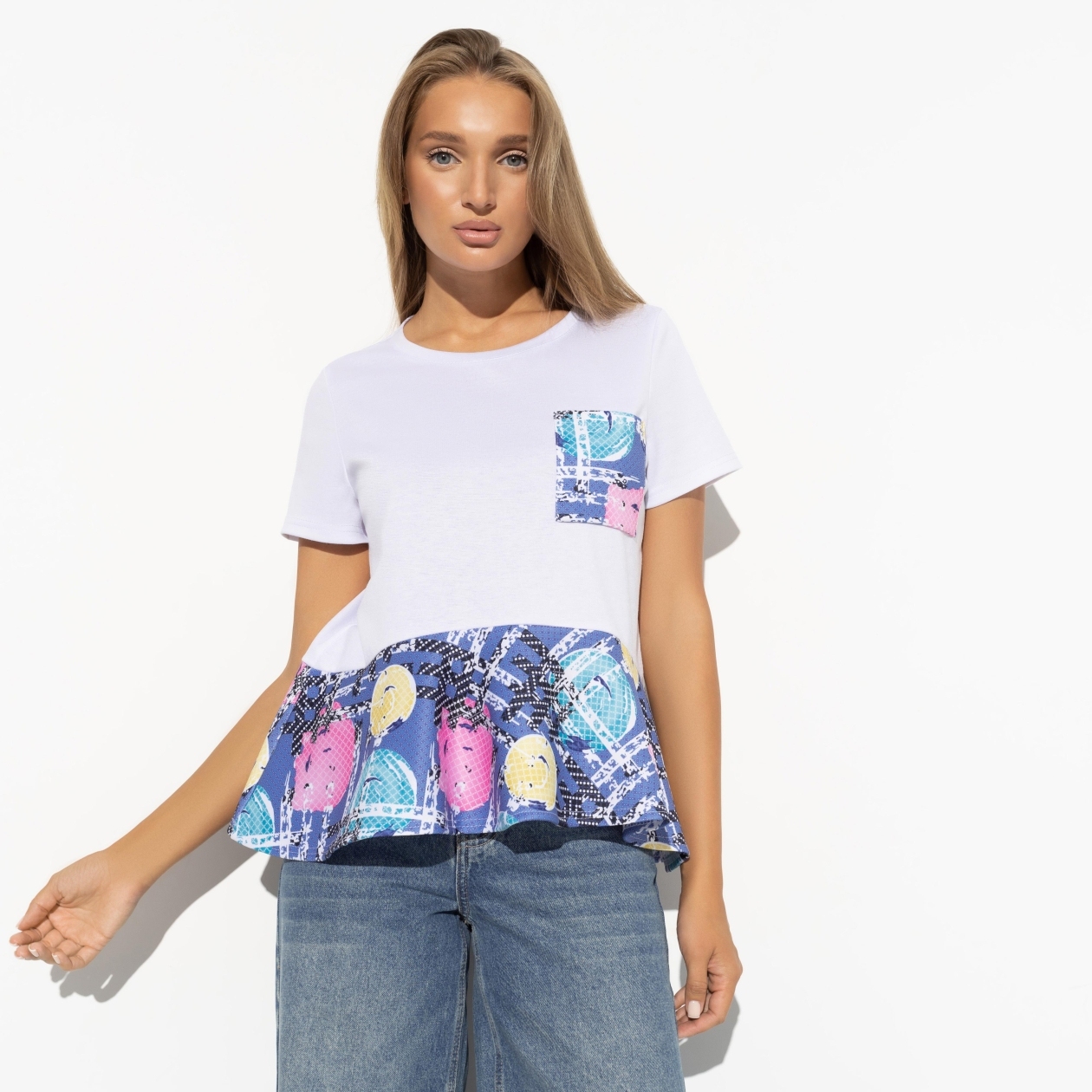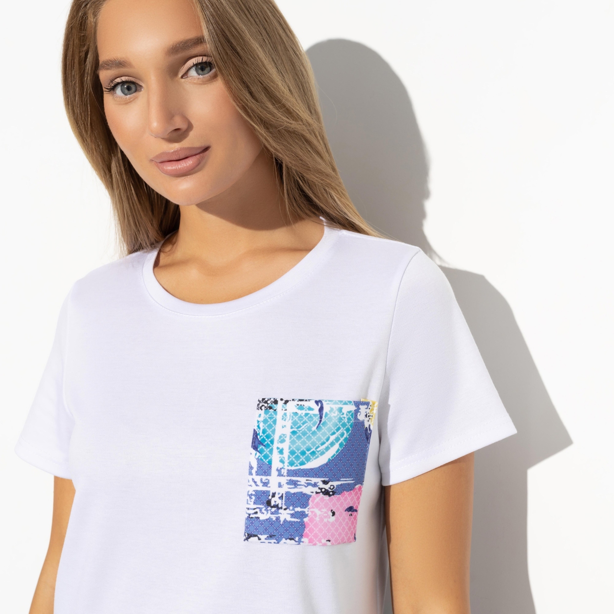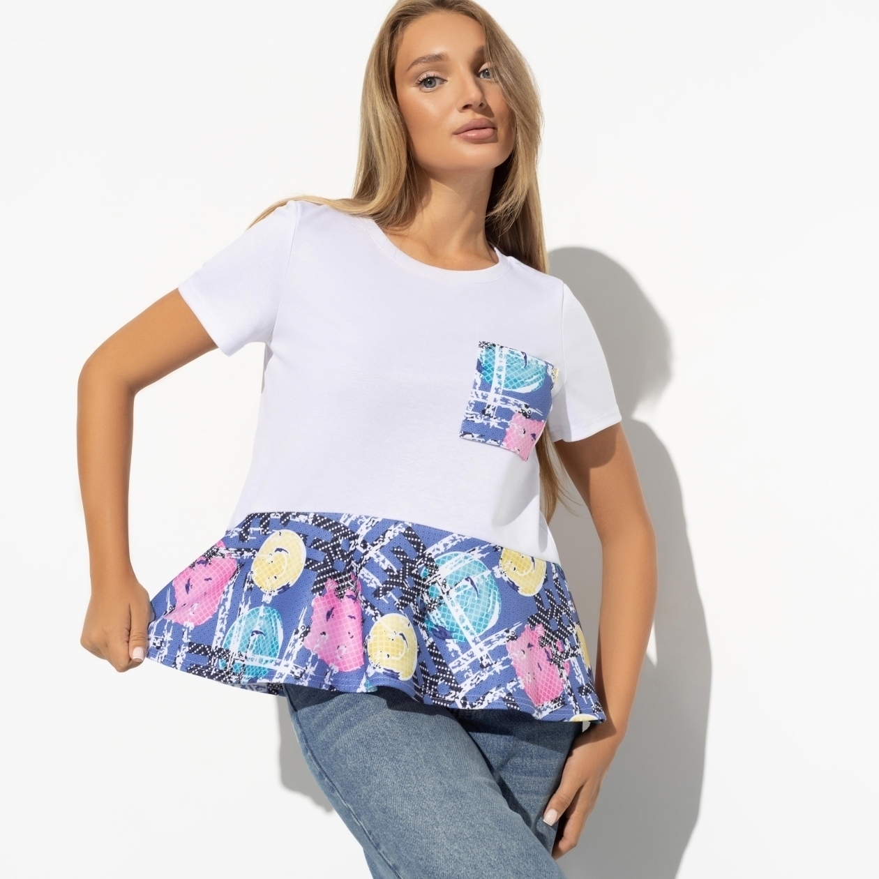Помните, как кропотливо вырезали бумажных куколок и крепили на неё такие же бумажные юбки и футболки. Настоящая модная медитация. С таким же умиротворением мы сейчас красуемся перед зеркалом, надевая на себя не бумажную, а самую настоящую одежду. Футболка свободного кроя. Карман из контрастной ткани вшит.