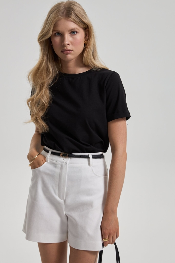 Базовая футболка из трикотажного полотна. Модель полуприлегающего силуэта. Короткий втачной рукав. Горловина обработана бейкой.