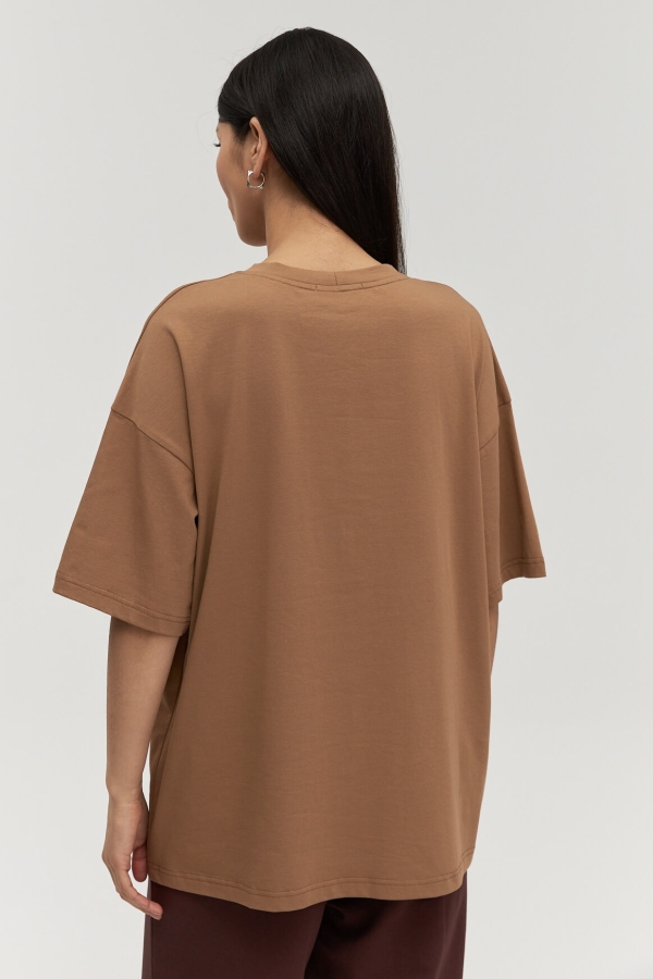 Стильная футболка из трикотажного полотна с авторским принтом. Оверсайз модель. Рукав спущенный. Горловина обработана бейкой.