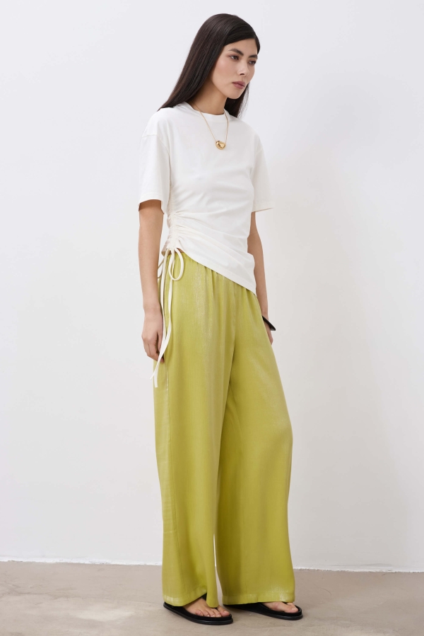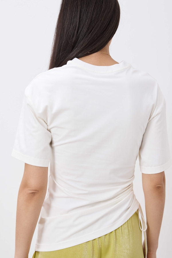 Футболка с акцентной деталью из хлопкового полотна. Модель приталенная со спущенным плечом и кулиской в боковом шве.