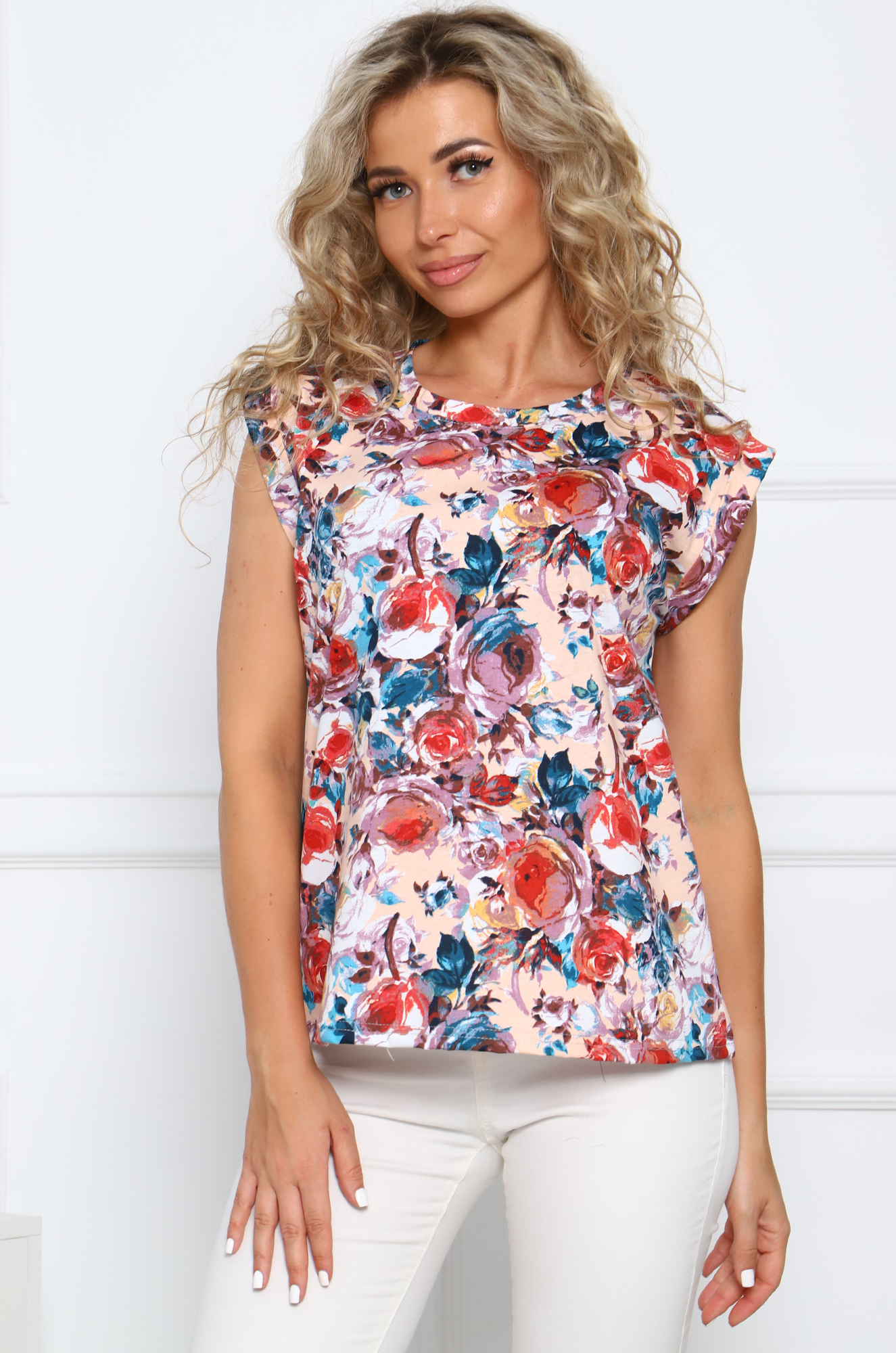 Хлопковая футболка приталенного силуэта с округлым вырезом горловины. Рукав цельнокроенный с отворотом. Ткань кулирка с набивным рисунком. Яркая цветовая гамма придаст настроения в летний сезон.