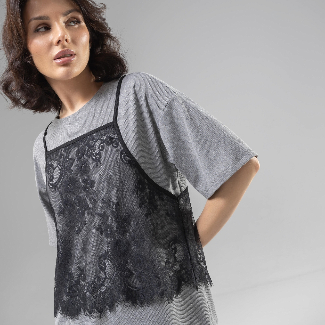 Высокий стиль требует изобретательности. Умение удивлять и вызывать уважение делает вас неподражаемой. Подтвердите свое модное превосходство футболкой CHARUTTI. Футболка свободного кроя. Материал футболки в деликатный рубчик. Топ из кружева – съемный. Топ на тонких бретелях. Все швы изделия обработаны.