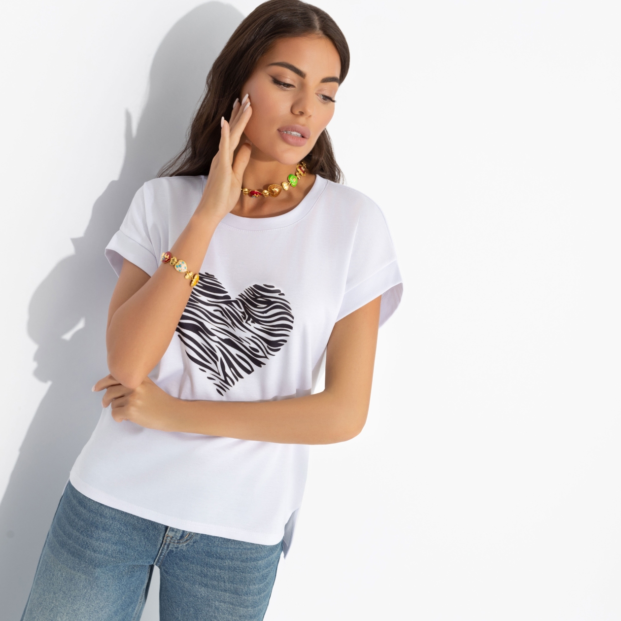 Вы открыты для всех и всего. Но в первую очередь для футболки от ЧАРУТТИ. Потому что это полный match. Ваши сердца звучат в унисон. Футболка прямого кроя. Спинка чуть длиннее передней. Сердечко с анималистическим флером. Цельнокроеный рукав, отвороты прошиты. Изделие хорошо смотрится в заправленном виде и навыпуск.
