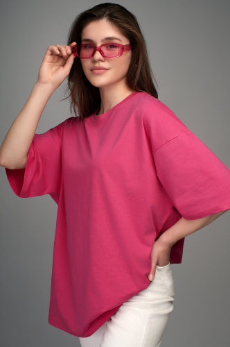 Трикотажная ярко-розовая футболка для женщин отлично подойдёт для образов в уличном стиле.