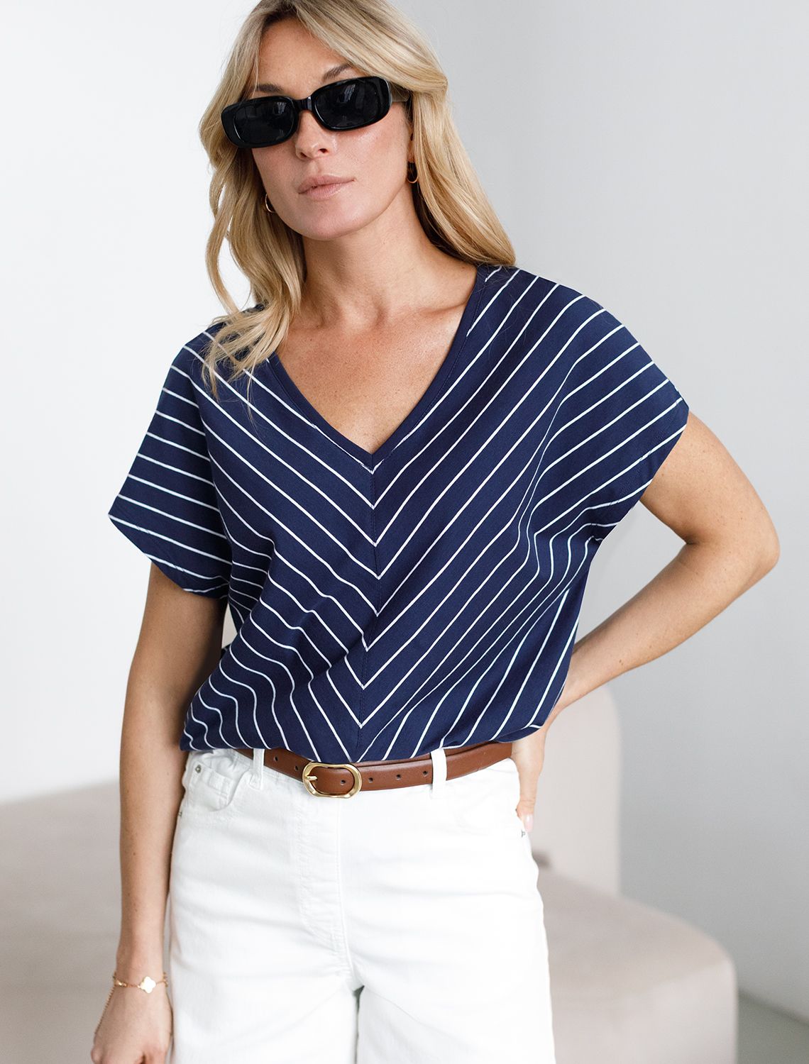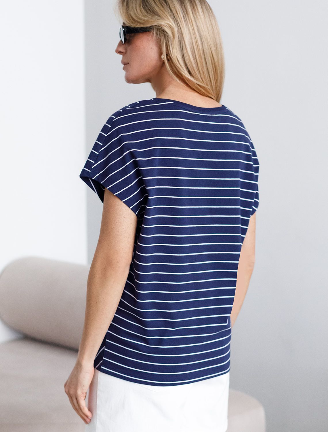 Футболка темно-синего цвета в беую полоску выполнена из гладкого эластичного хлопка плотностью 170 Г/м2. Модель с цельнокроеным рукавом, который гарантирует свободу движений, что особенно актуально для активного образа жизни. V-вырез подчеркивают геометрично соединенные полосы. В отличии от классической горизонтальной полоски, такой орнамент стройнит, вытягивает силуэт и придает образу эффектности. Свободная футболка подходит любому типу фигуры, в том числе и на большие размеры. Приятный к телу хлопок не вызывает раздражения и подходит для ежедневной носки. Сочетание гладкой текстуры и эластичных свойств позволяет футболке выглядеть аккуратно и стильно даже после множества стирок. Легкая футболка сочетается с базовыми элементами одежды, позволяет создавать различные повседневные или яркие образы.