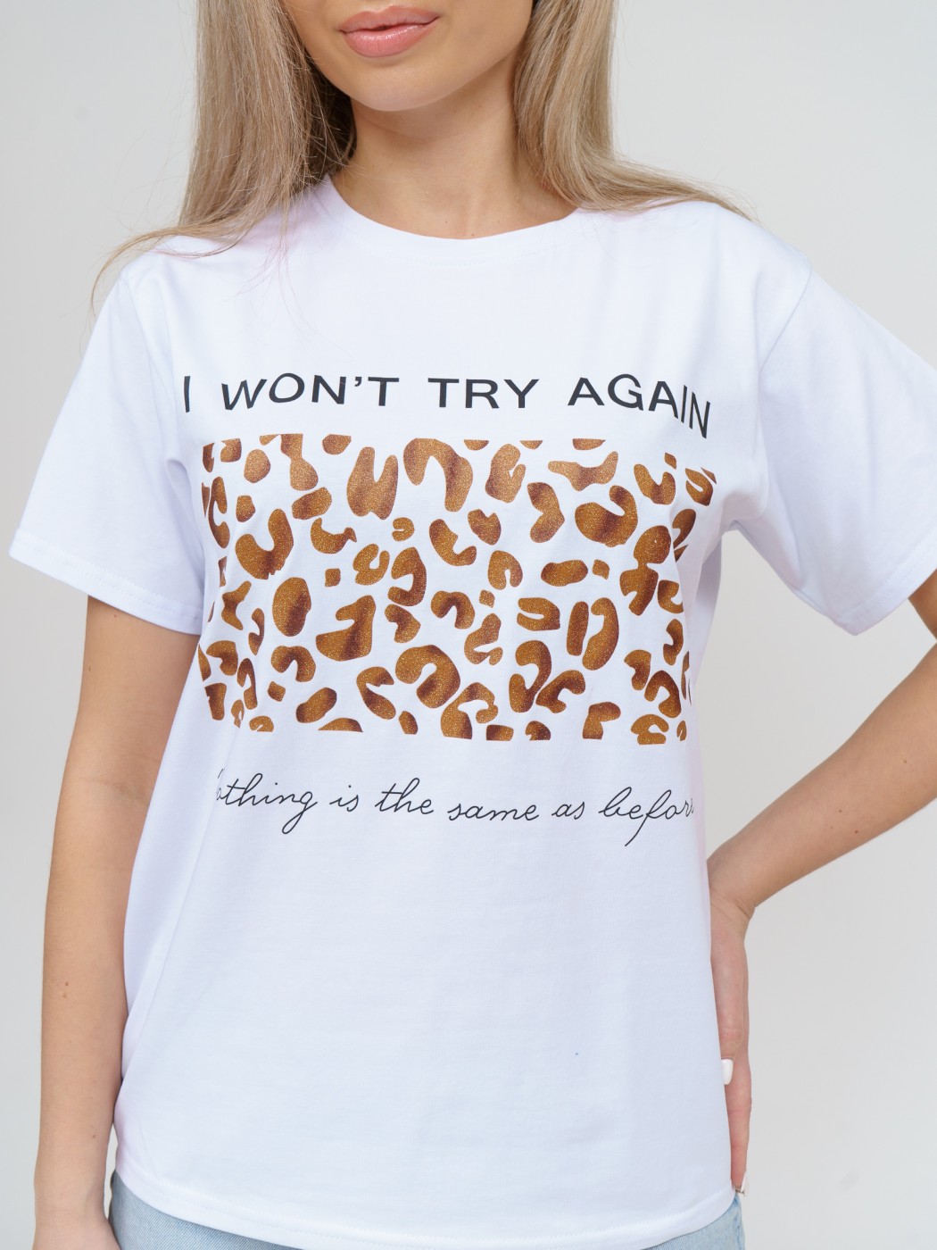 Стильная футболка с печатью прямого кроя из качественной эластичной кулирки с лайкрой.