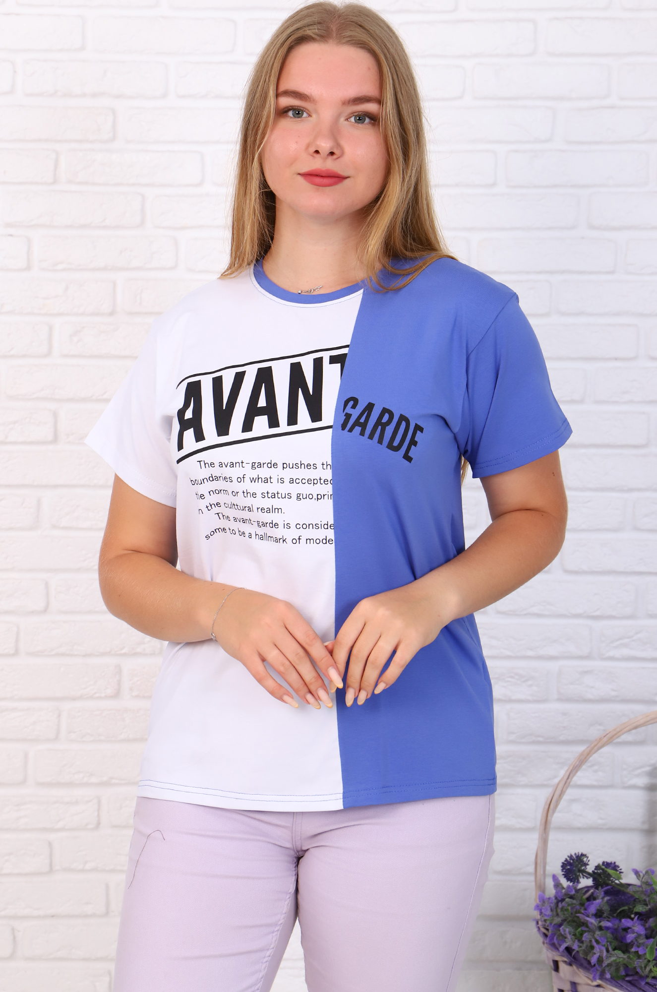 Стильная комбинированная футболка прямого кроя, на полочке печатный принт.