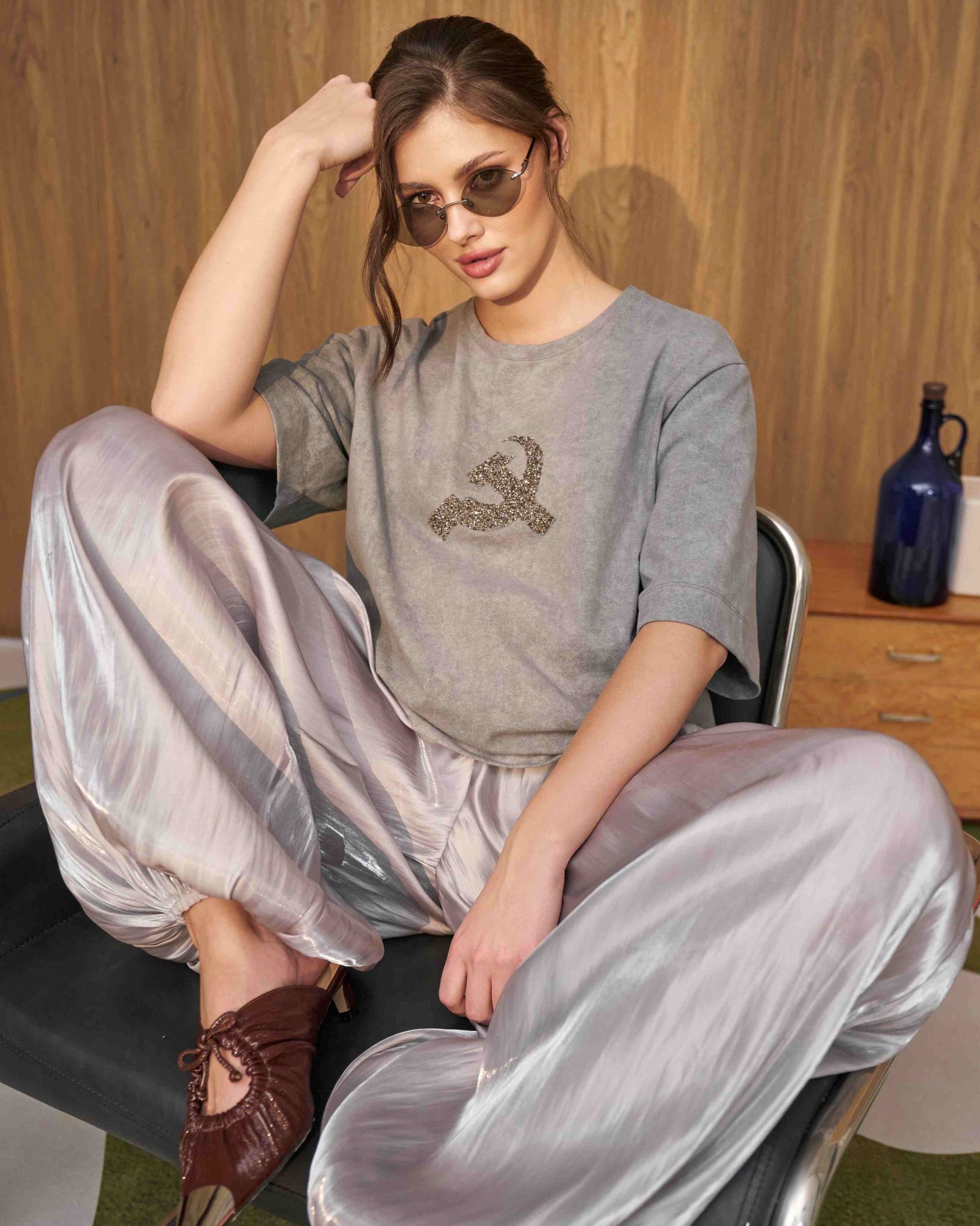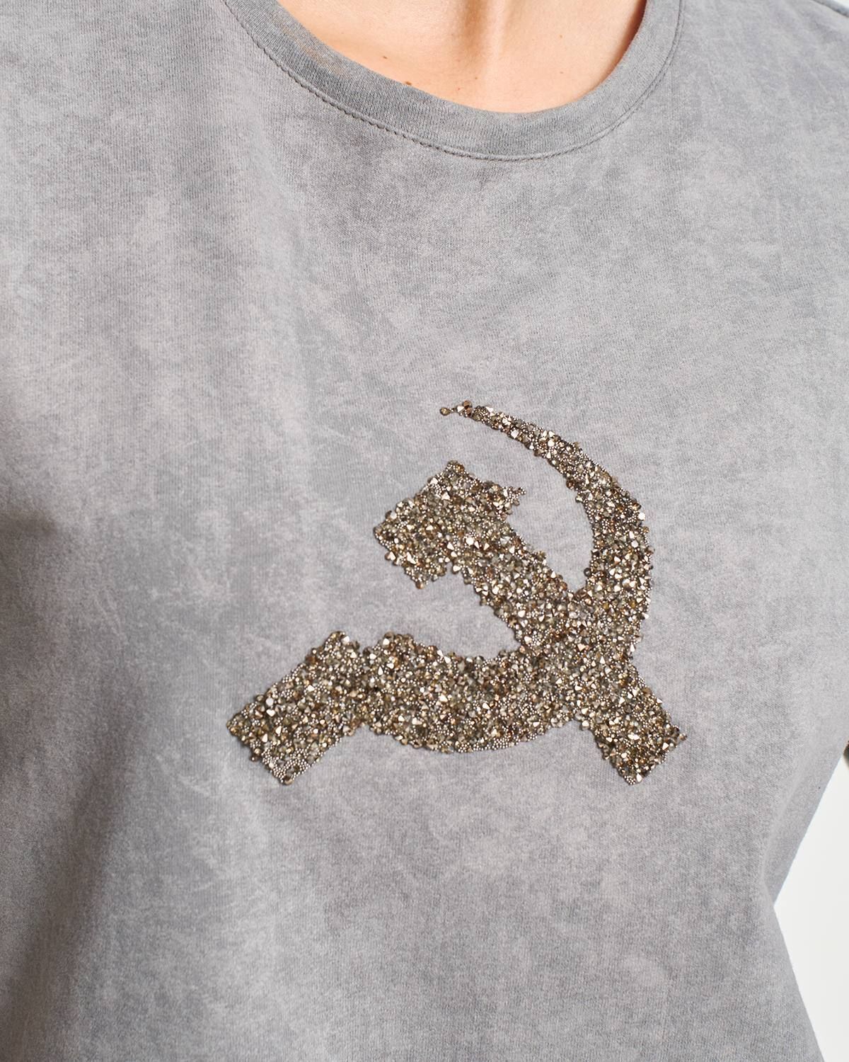 Футболка в русской тематике из высококачественного хлопка, отличающегося своей мягкостью и комфортностью. Особенностью дизайна является оригинальная аппликация в виде символического серпа и молота, выполненная из сверкающих кристаллов, которые эффектно блестят и переливаются на свету.