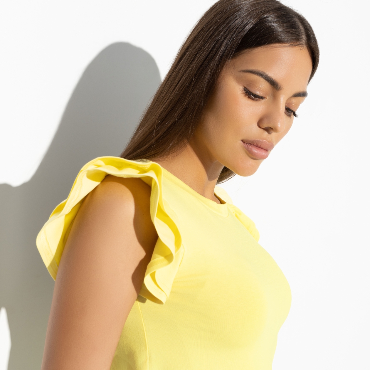 Завоевать сердца многих? Легко! В футболке пастельно-желтого цвета. Воланы на плечах, классическая посадка делают футболку оружием массового ми-ми-мишного поражения.