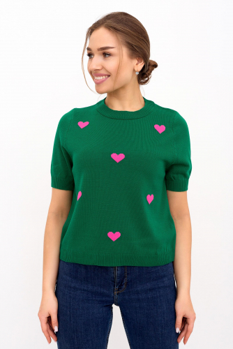 Милая и модная вязаная футболка Сердечки для нежных девушек. Мягкая, дышащая ткань приятна к телу. Короткие рукава, удобная длина футболки позволит носить ее каждый день с большим удовольствием. Футболка стильно смотрится на женской фигуре, легко сочетается как с брюками, так и юбками. Большой выбор ярких расцветок на любой вкус.