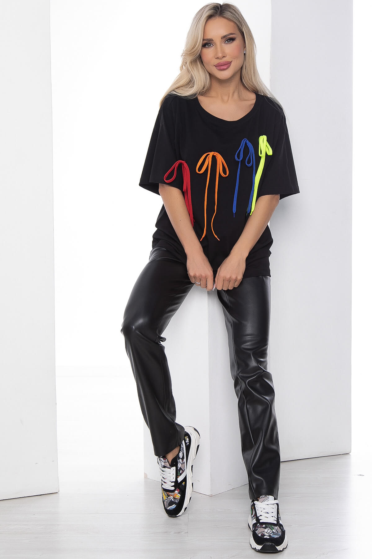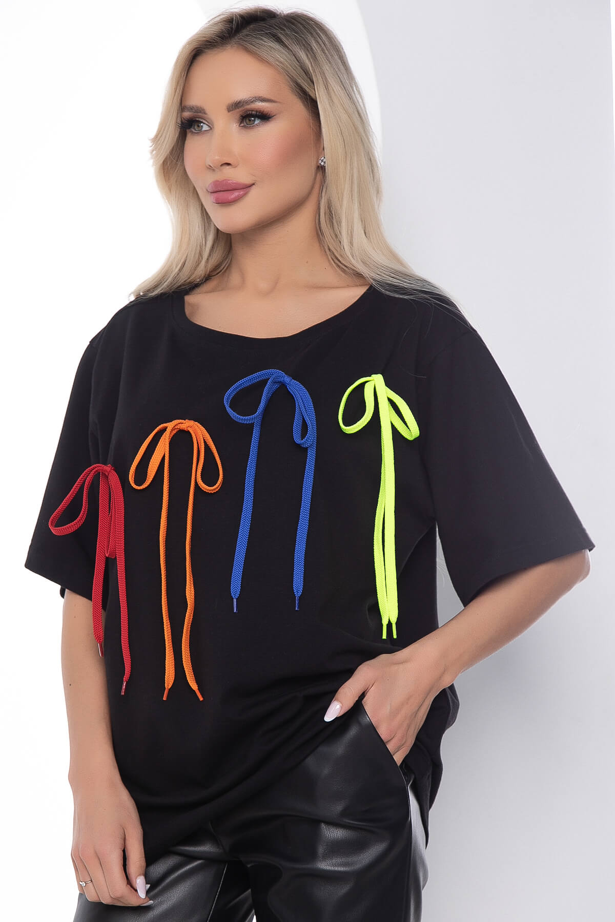 Невероятная удлиненная модель футболки в стиле оверсайз. Футболка изготовлена из приятной мягкой ткани средней плотности. Изделие имеет яркий необычный акцент в виде ярких шнурочков, завязать/ развязать которые можно по своему желанию и сделать их разной длины и формы. Среди множества футболок, эта модель займет особое место в вашем гардеробе. Футболка прекрасно будет сочетаться с любыми спортивными, кожаными брюками и джинсами. Весна и лето - прекрасное время для ярких красок!