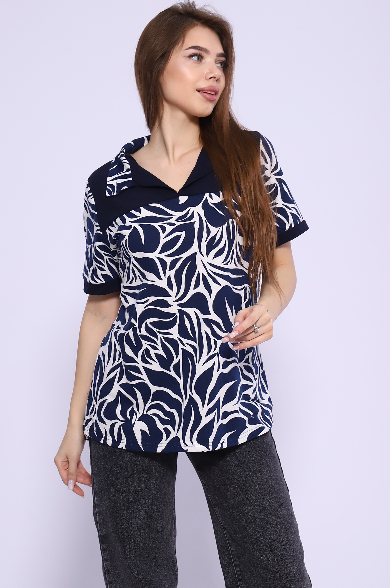 Удобная женская футболка из мягкого хлопка. Модель с отложным воротником, с отрезной кокеткой из однотонной ткани, спинка немного удлинённая, пришивные манжеты на рукавах в тон кокетке. Очень стильно смотрится с джинсами, шортами или леггинсами. Такая модель отлично подходит на любую фигуру и на разный возраст.
