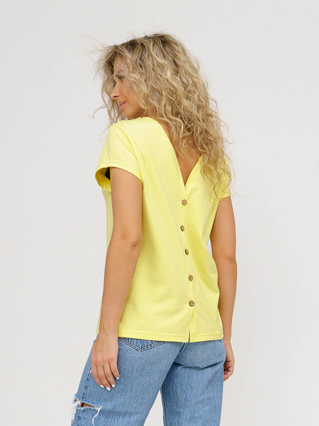 Футболка с оригинальным кроем, спинка выполнена на запах с фальшивой застежкой на пуговицы. Изделие представлено в нескольких базовых цветах.