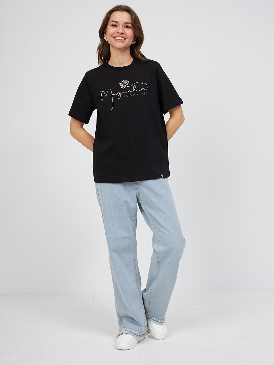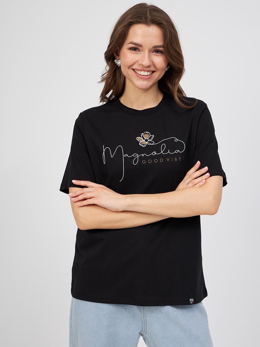 Женская футболка F5, Comfort fit (свободный силуэт), круглый вырез горловины, короткий рукав. Выполнена из классического трикотажного полотна. 100%Хлопок
