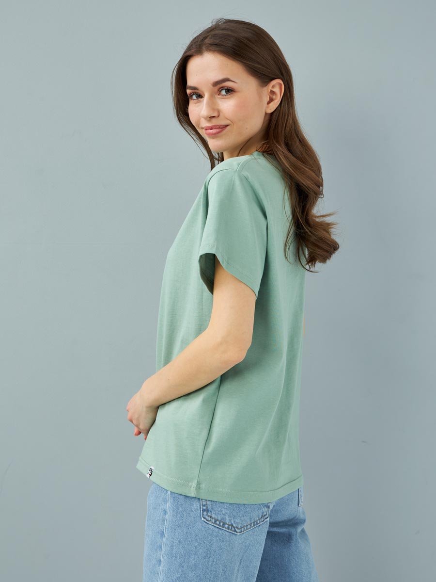 Женская футболка F5, Oversize fit (свободный силуэт), круглый вырез горловины, короткий цельнокроеный рукав. Выполнена из классического трикотажного полотна.