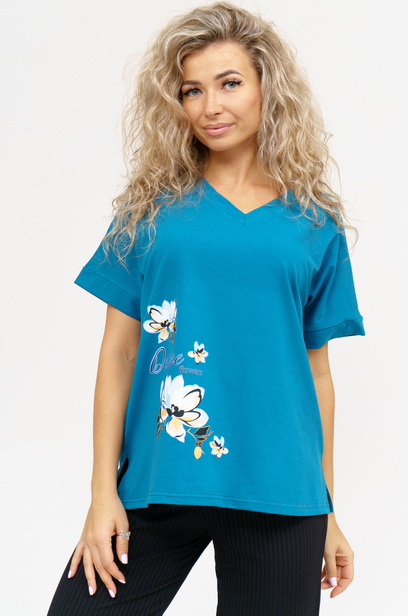 Женская яркая футболка с цветочным принтом. Модель прямого кроя с разрезами по бокам. Рукав цельнокроеный на манжете. Глубокий вырез "галочкой" подчеркнёт зону декольте и сделает образ привлекательным. Отлично будет сочетается с джинсами, шортами или лосинами, создавая модный образ.