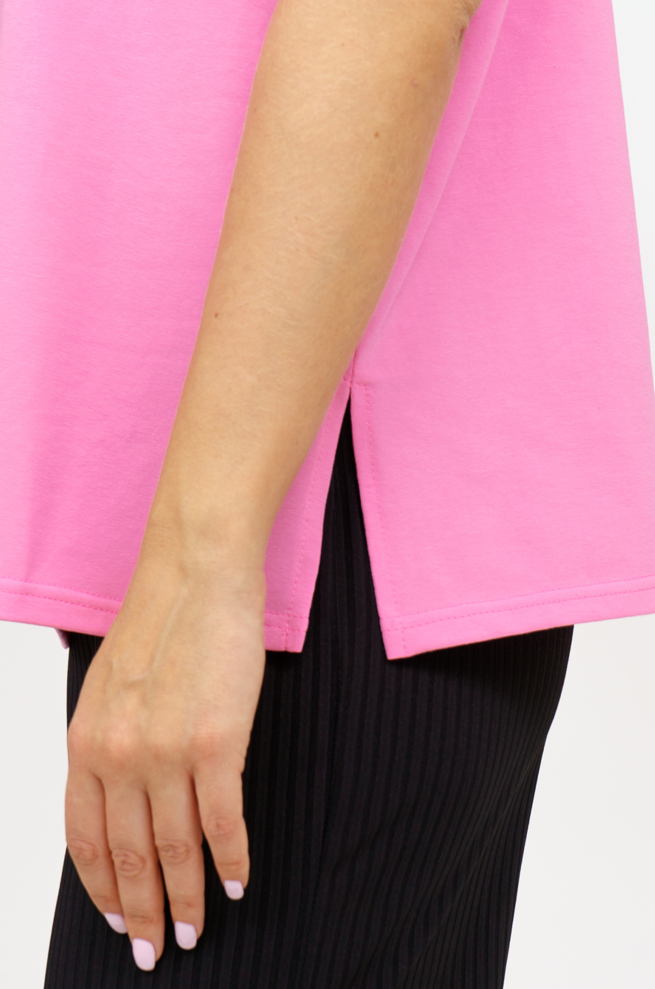 Женская яркая футболка с цветочным принтом. Модель прямого кроя с разрезами по бокам. Рукав цельнокроеный на манжете. Глубокий вырез "галочкой" подчеркнёт зону декольте и сделает образ привлекательным. Отлично будет сочетается с джинсами, шортами или лосинами, создавая модный образ.